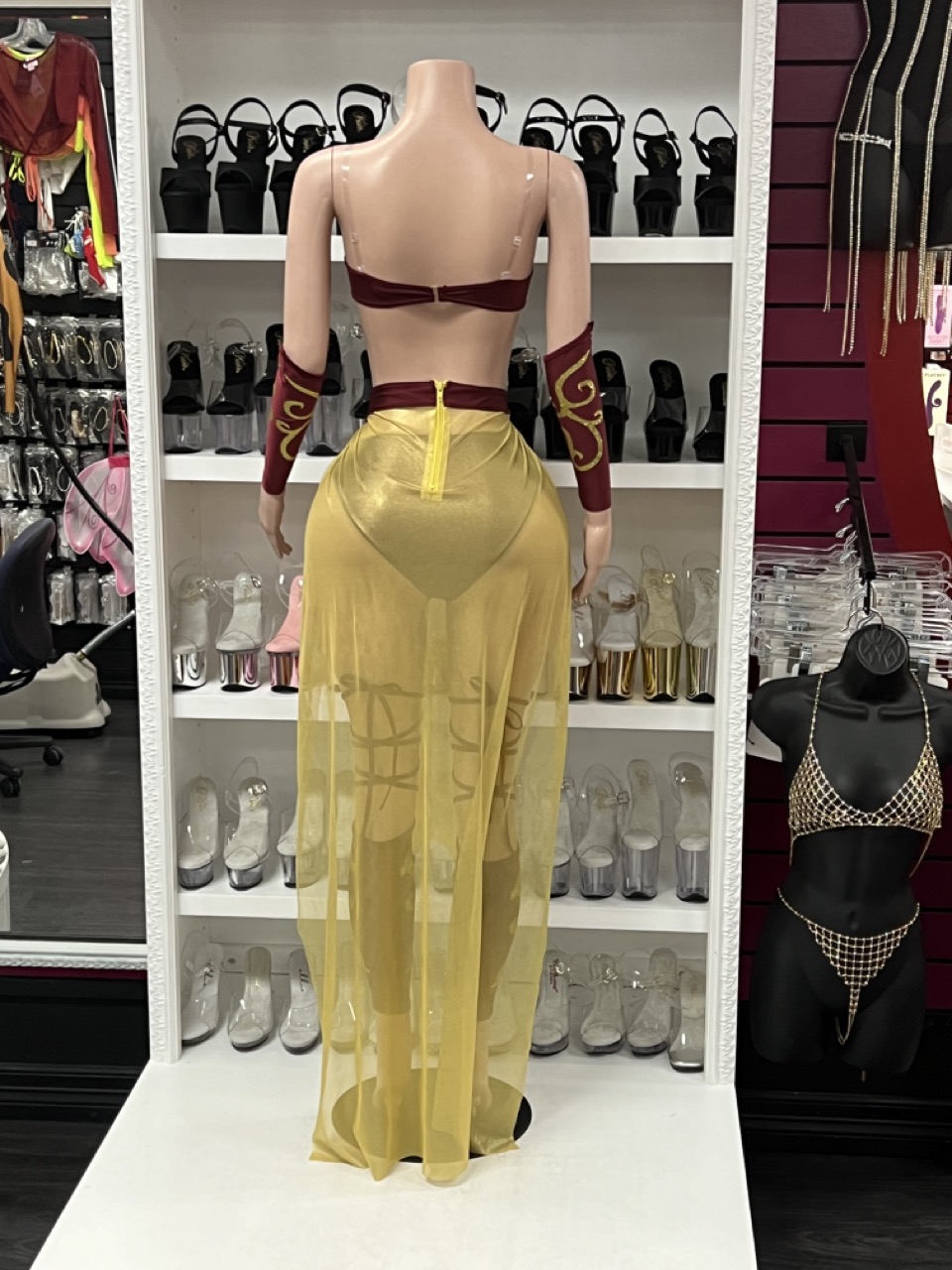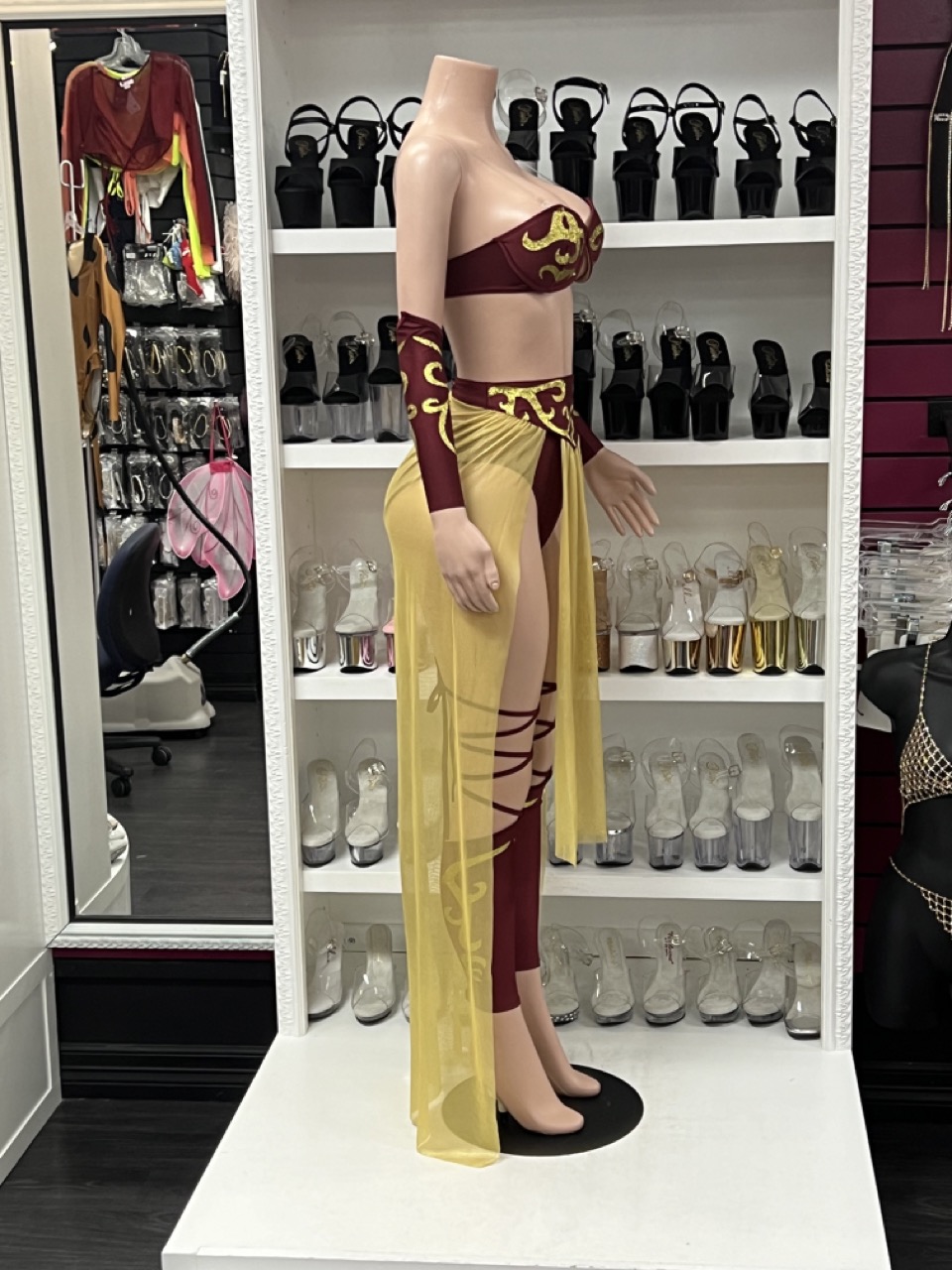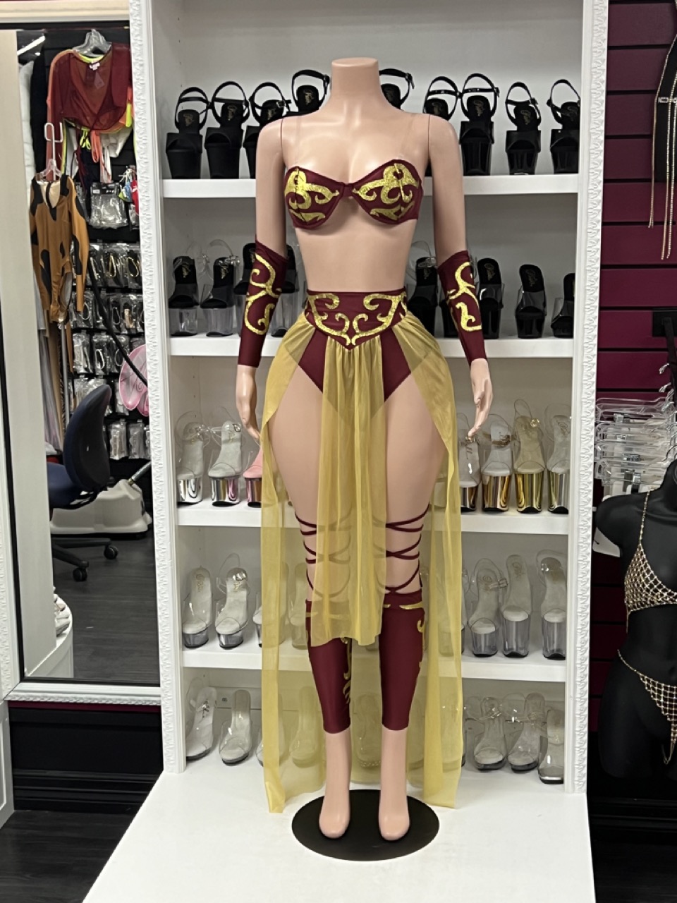 6-piece sexy gladiator costume features strapless underwire cup bra and panty paired with M-slit skirt and lace-up leg accessories and gauntlets and headpiece. No returns or exchanges.