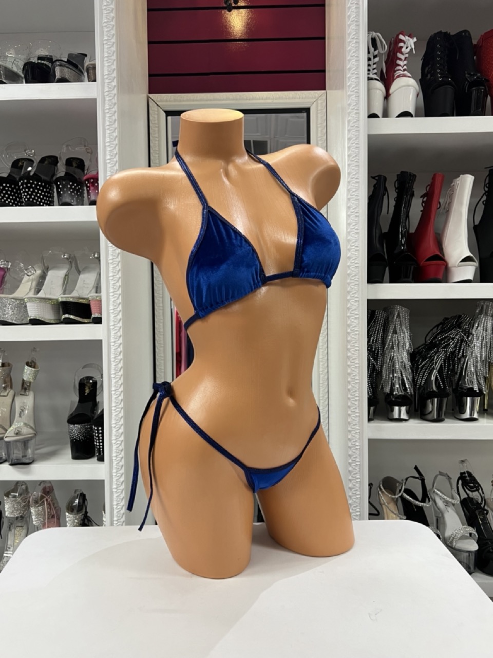 Royal Blue Velvet Micro Bikini features a sleek, minimal design with a rich, bold color. This two piece set includes a triangle top and tie side thong for a flattering, adjustable fit.