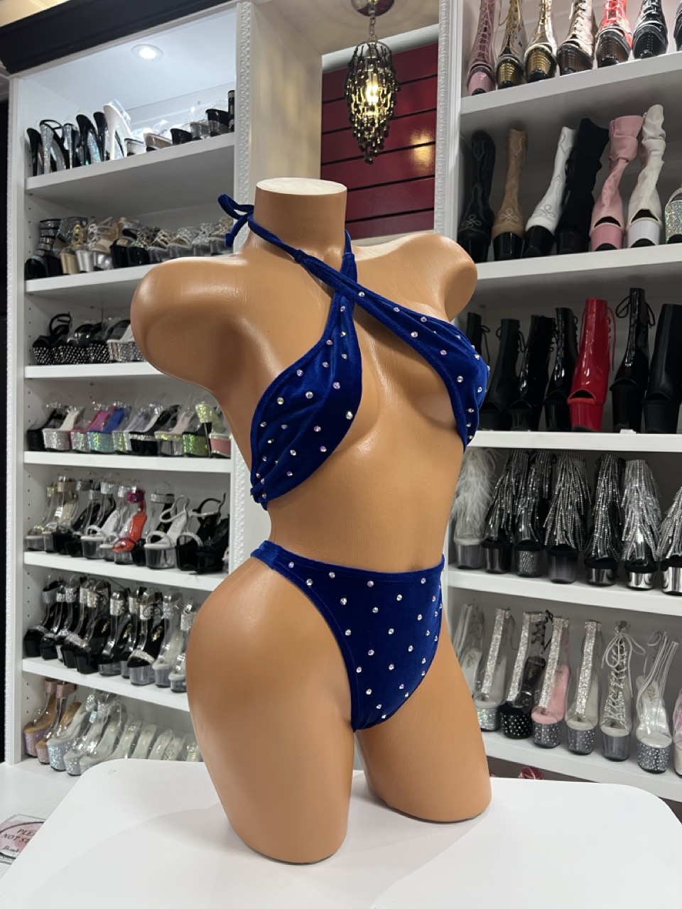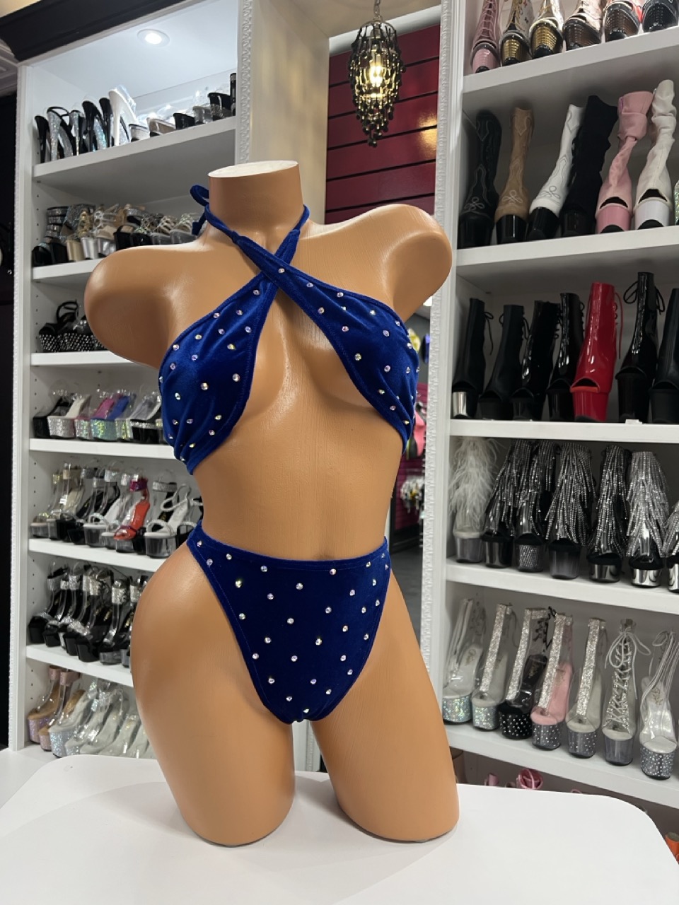 💙 Includes velvet rhinestone halter top + high-cut matching bottoms