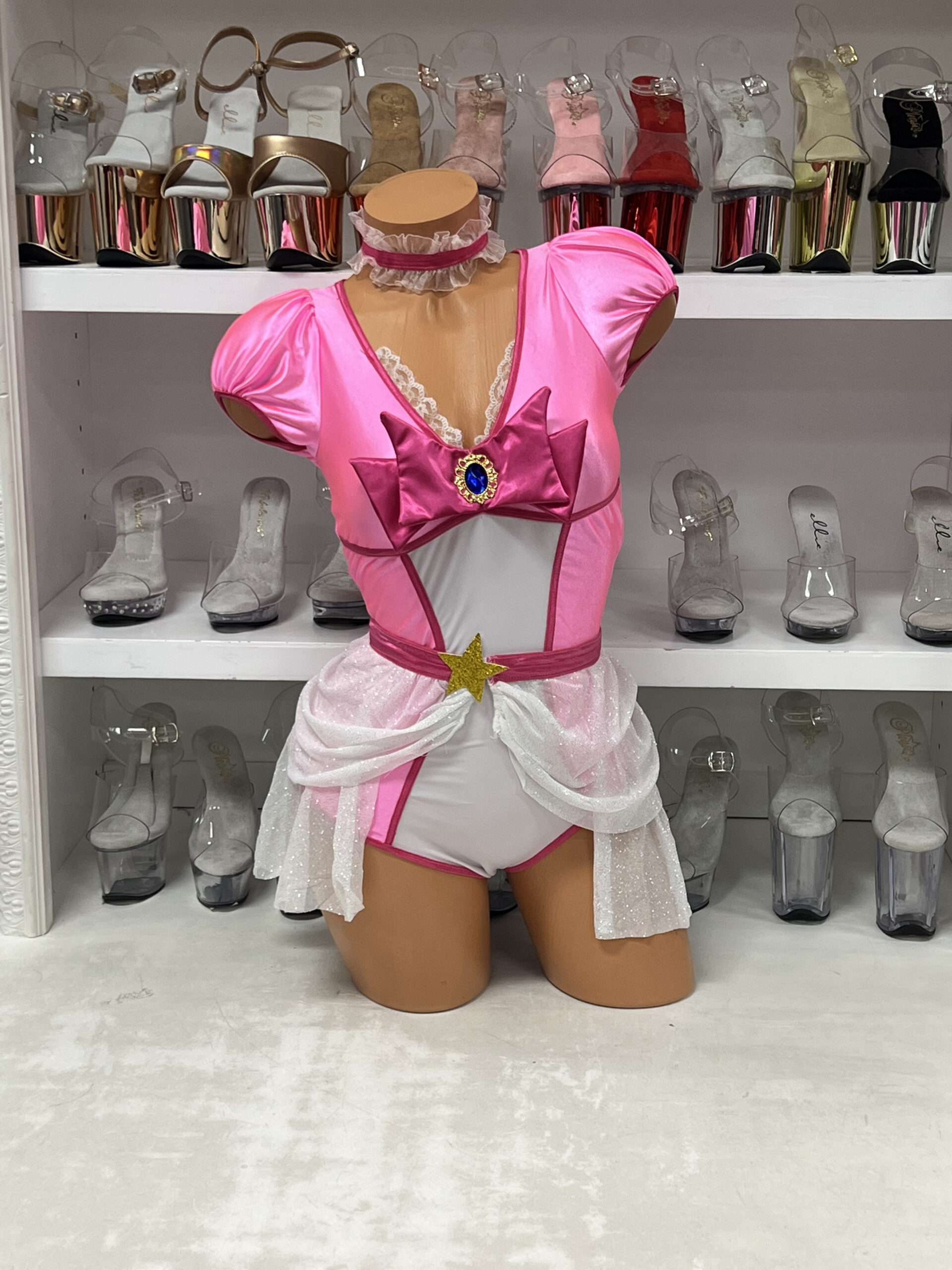 Pink wet look romper with contrast hot pink binding, white panels, puffy cap sleeves, matching choker, sheer glitter overskirt, white gloves, mushroom purse, and crown. No returns or exchanges.