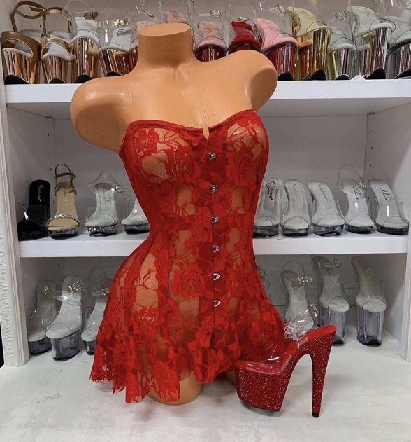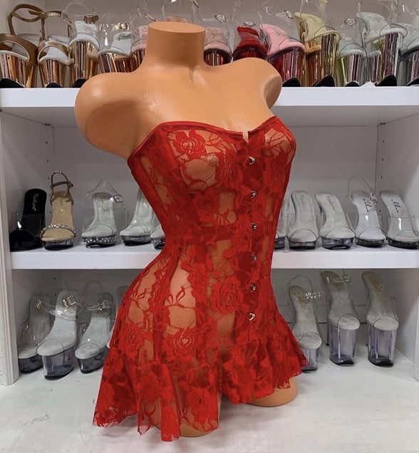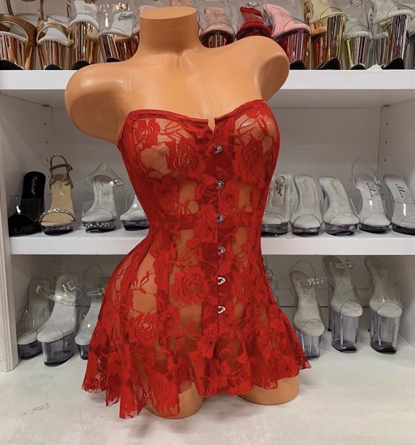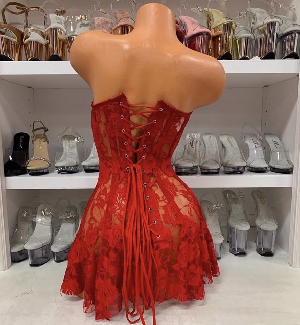 Scarlet Lace Corset Dress in sheer floral lace with hook closures and scalloped hem. Elegant, daring, and made to captivate.