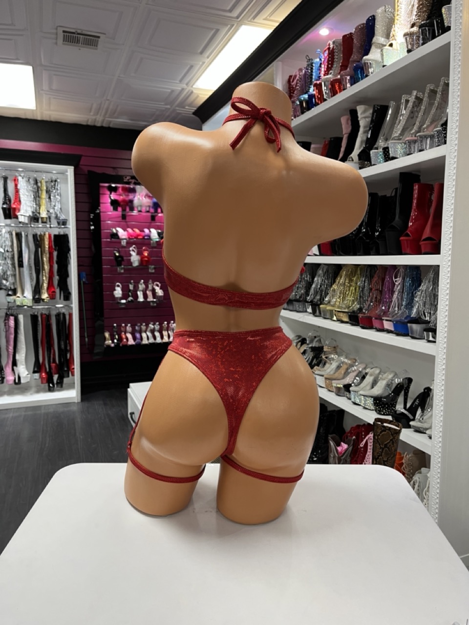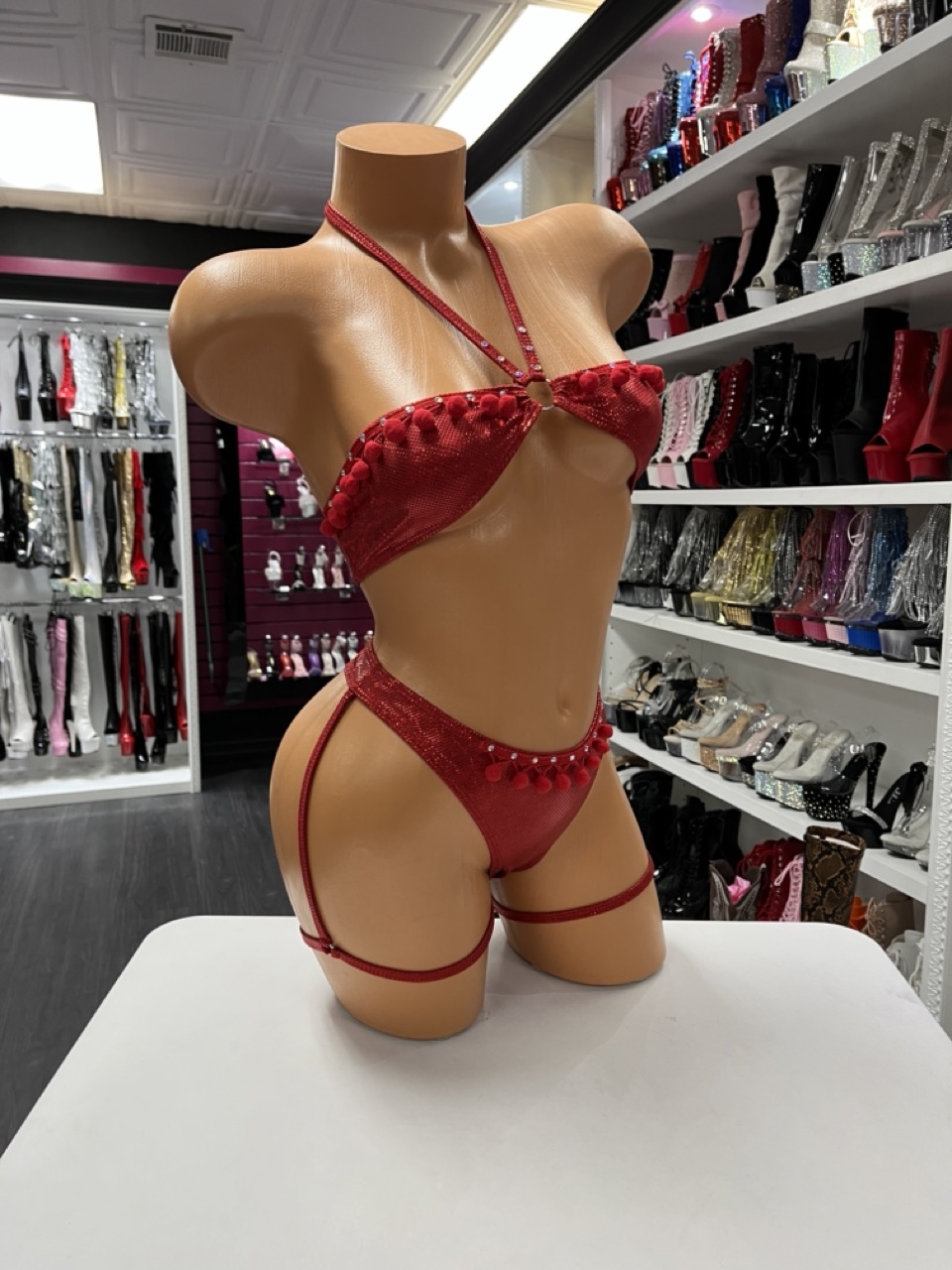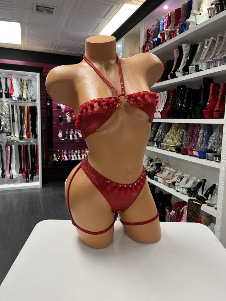 Red shimmer bandeau set with playful pom pom trim and high-cut bottoms. Bold, fiery, and stage ready.