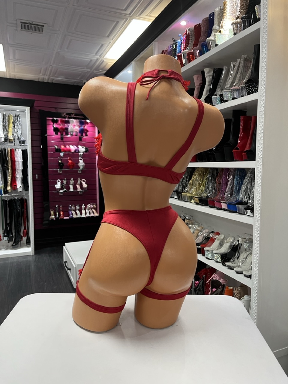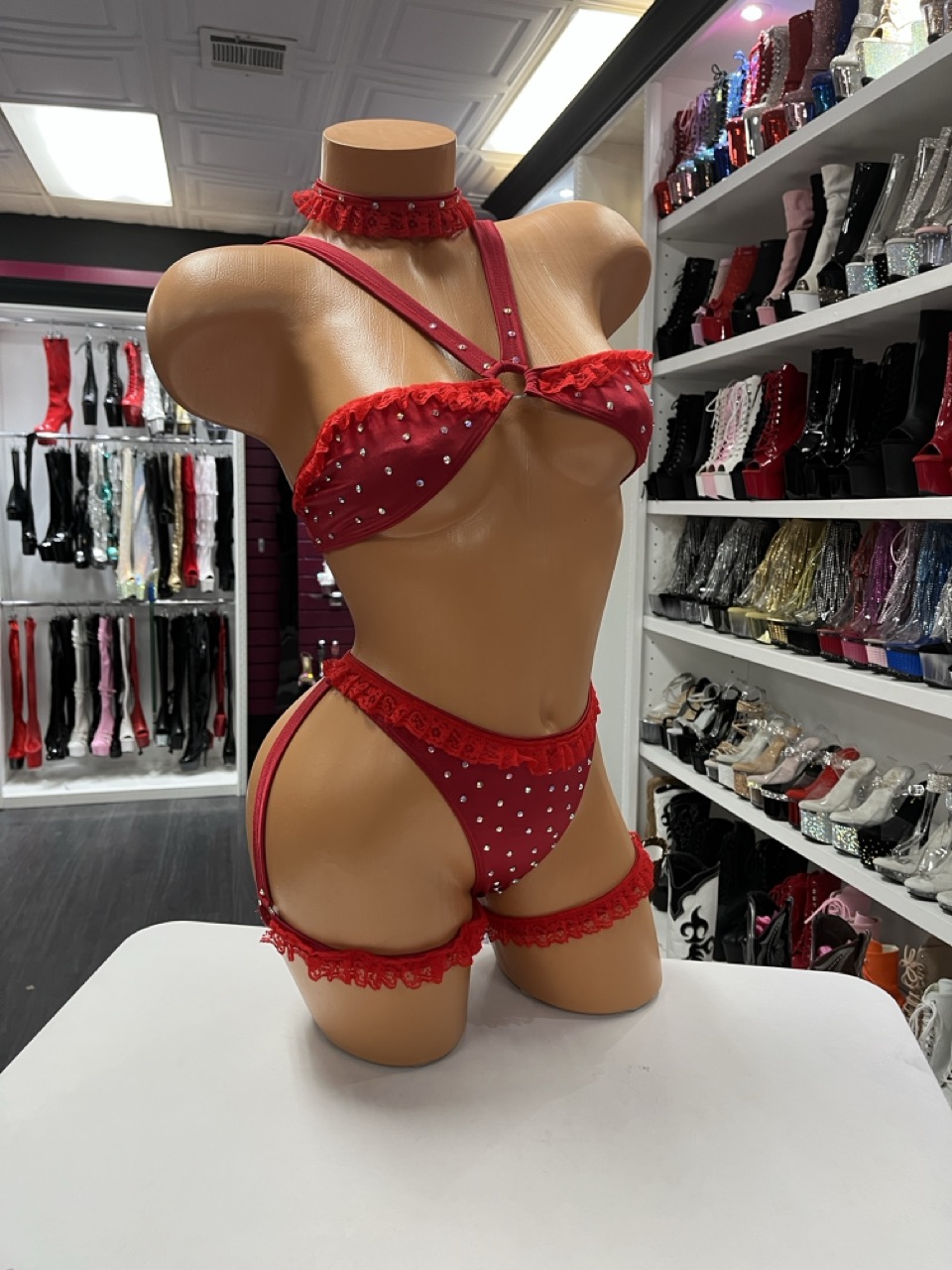 A bold scarlet two piece garter set with lace trim, sparkling rhinestones, and attached leg garters for confident stage styling.