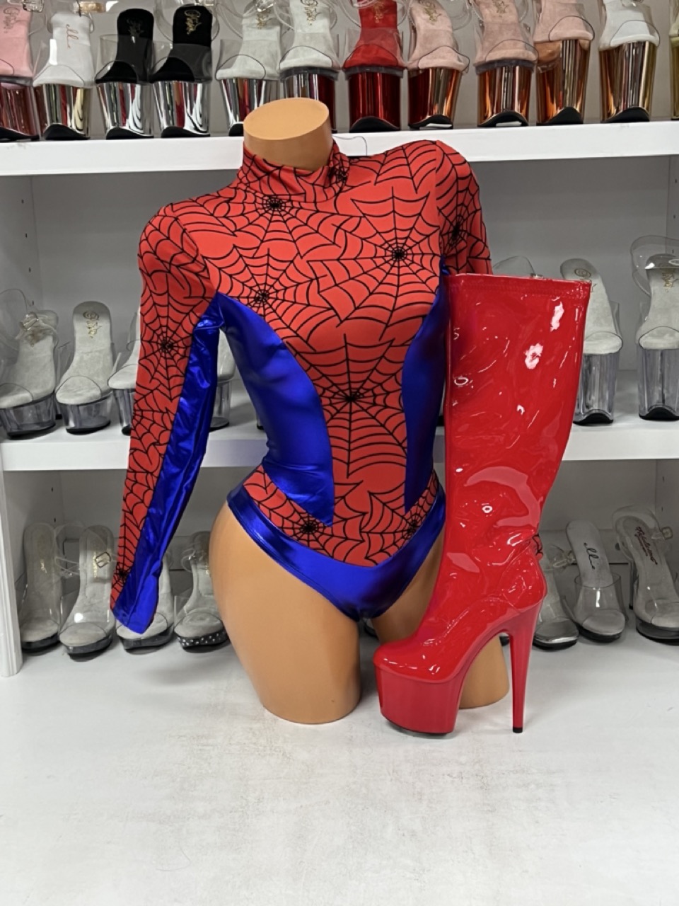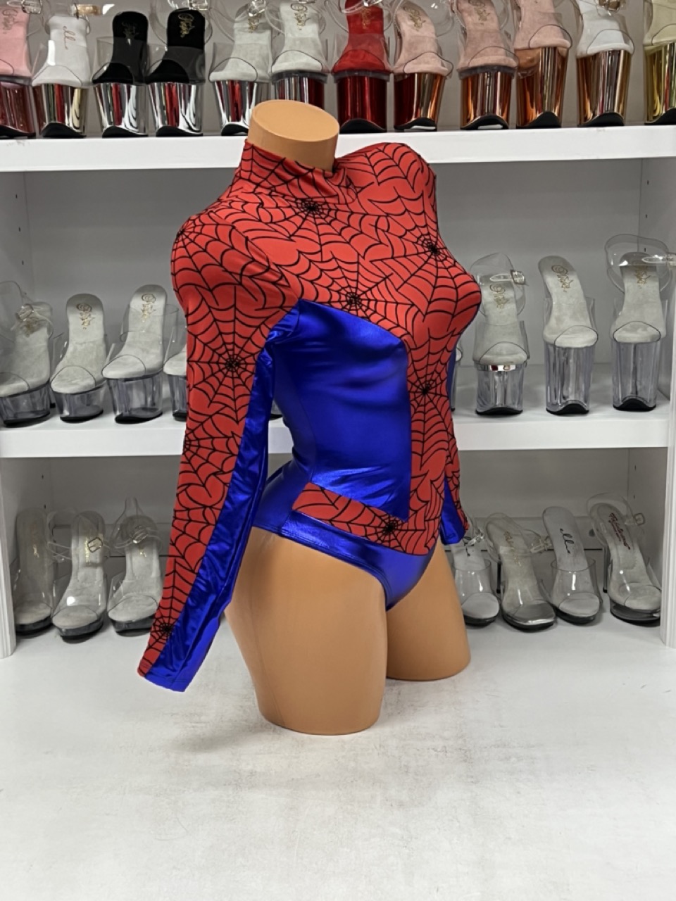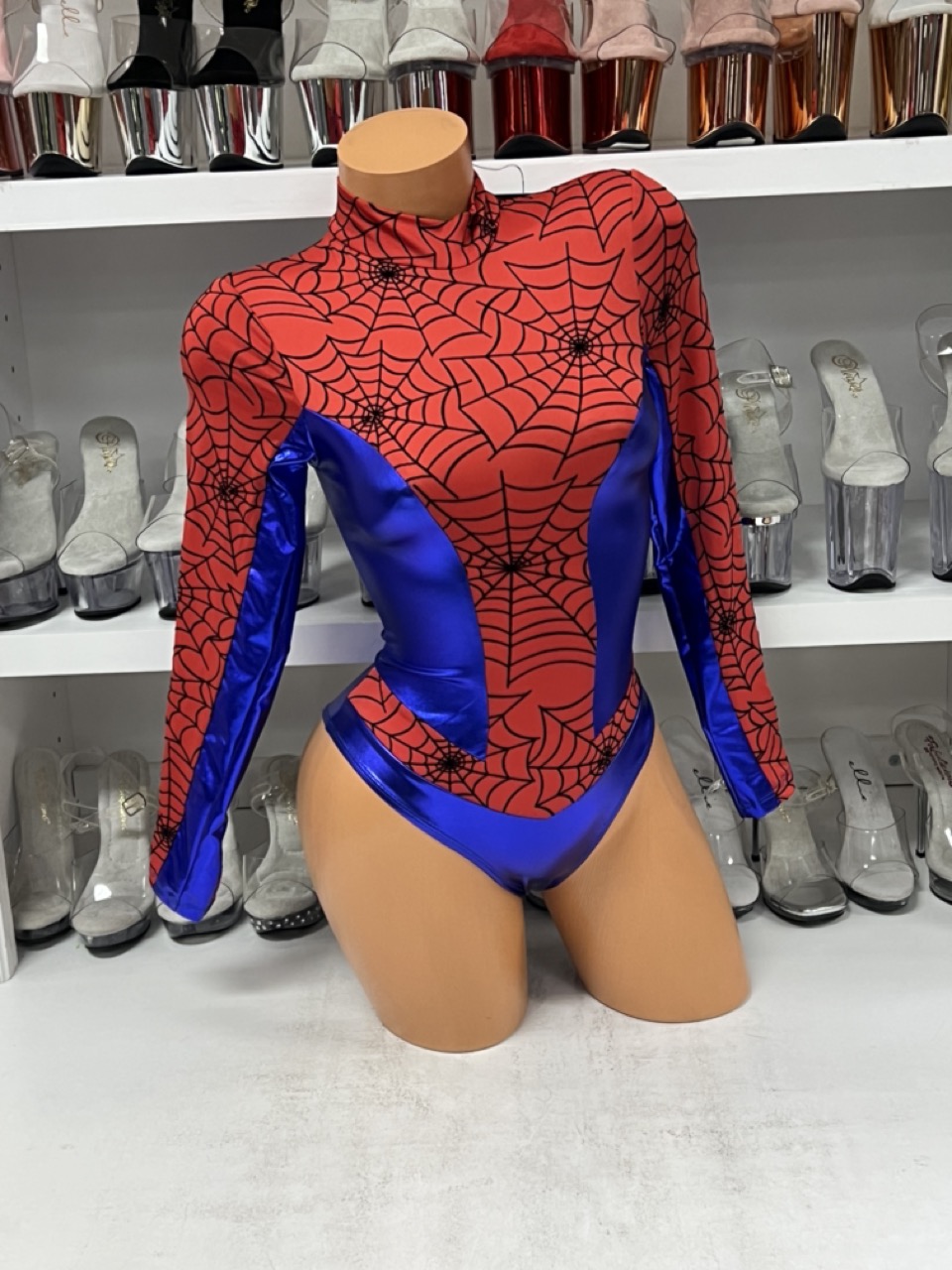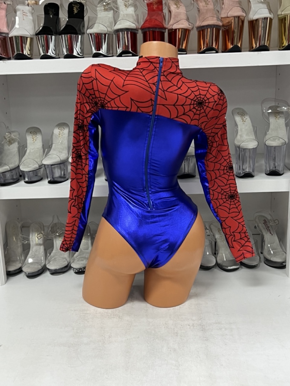 This striking sensible seductress costume features a form-fitting bodysuit in iconic red and blue with detailed web pattern design. The high-quality stretchy materials ensure comfort and durability while the superhero styling creates an empowering and alluring look perfect for themed events and performances. No returns or exchanges.