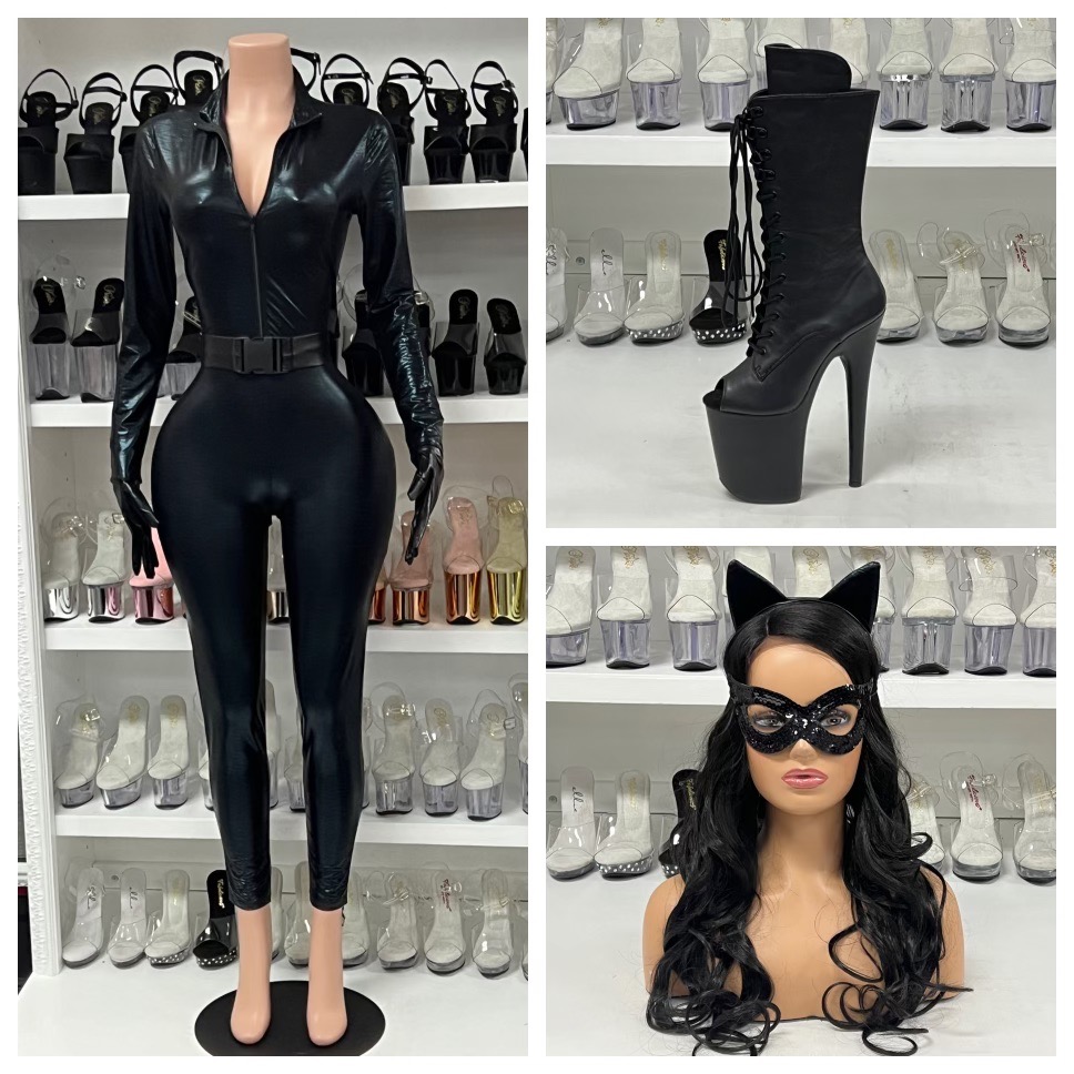 Sexy cat costume Fierce Feline with black jumpsuit, cat ears, mask, belt, and gloves from PZHouston.