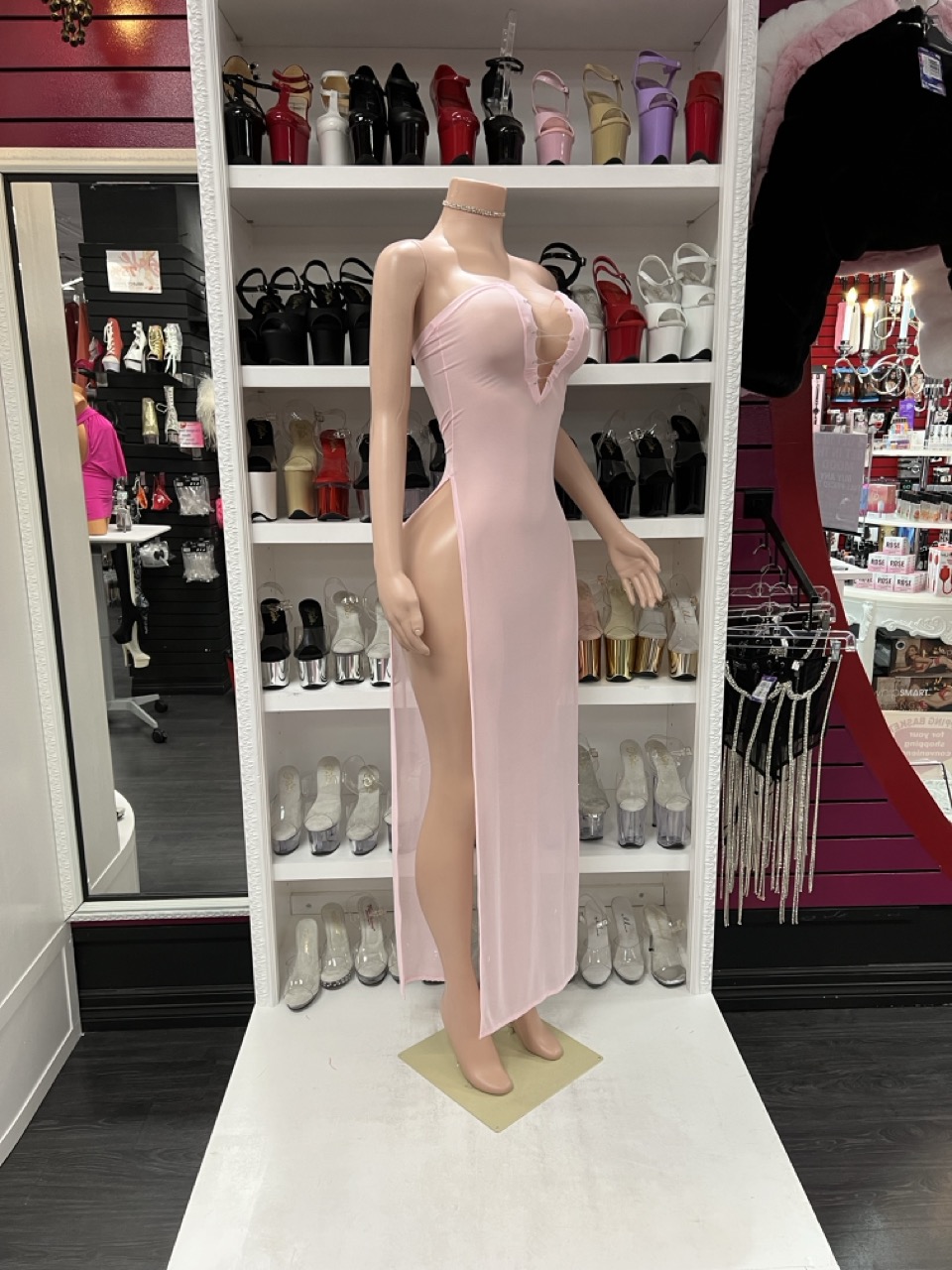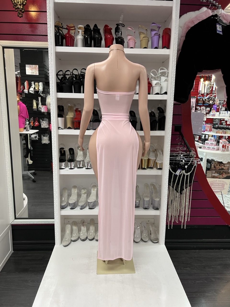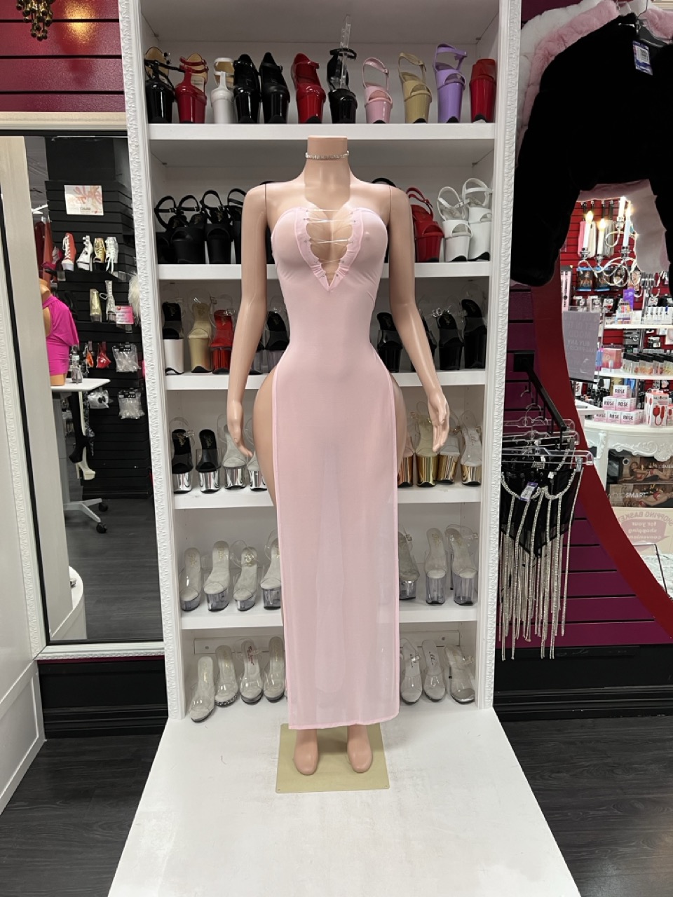 The sheer baby pink lace-up dress is your go-to for dreamy nights and daring entrances. With soft mesh that catches the light and a front lace-up design that dips low, this gown balances elegance with edge. Whether you’re slipping into something sultry for a romantic night in or dressing to impress on stage, this piece brings the heat while keeping it soft and feminine.