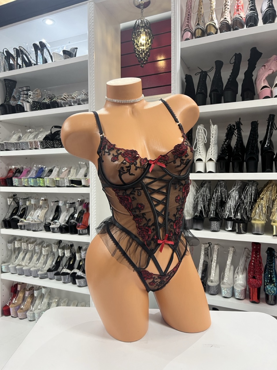 Sheer lace bodysuit with embroidered mesh panels and adjustable straps displayed on mannequin