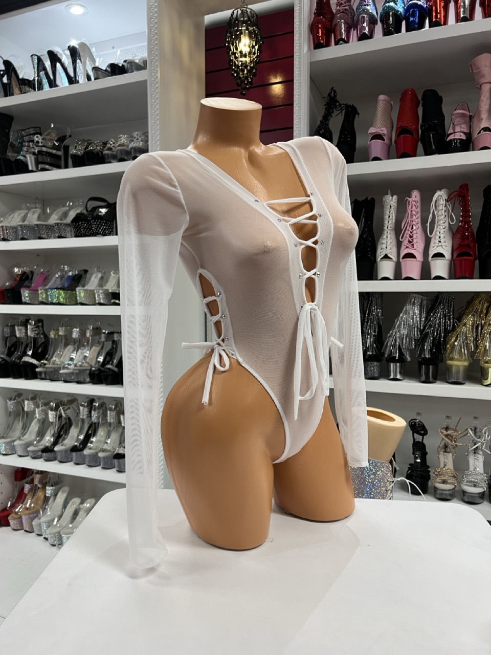 A bold sheer mesh bodysuit featuring a lace-up front and long sleeves for confident stage presence. Designed for comfort, flexibility, and customizable fit during performance.