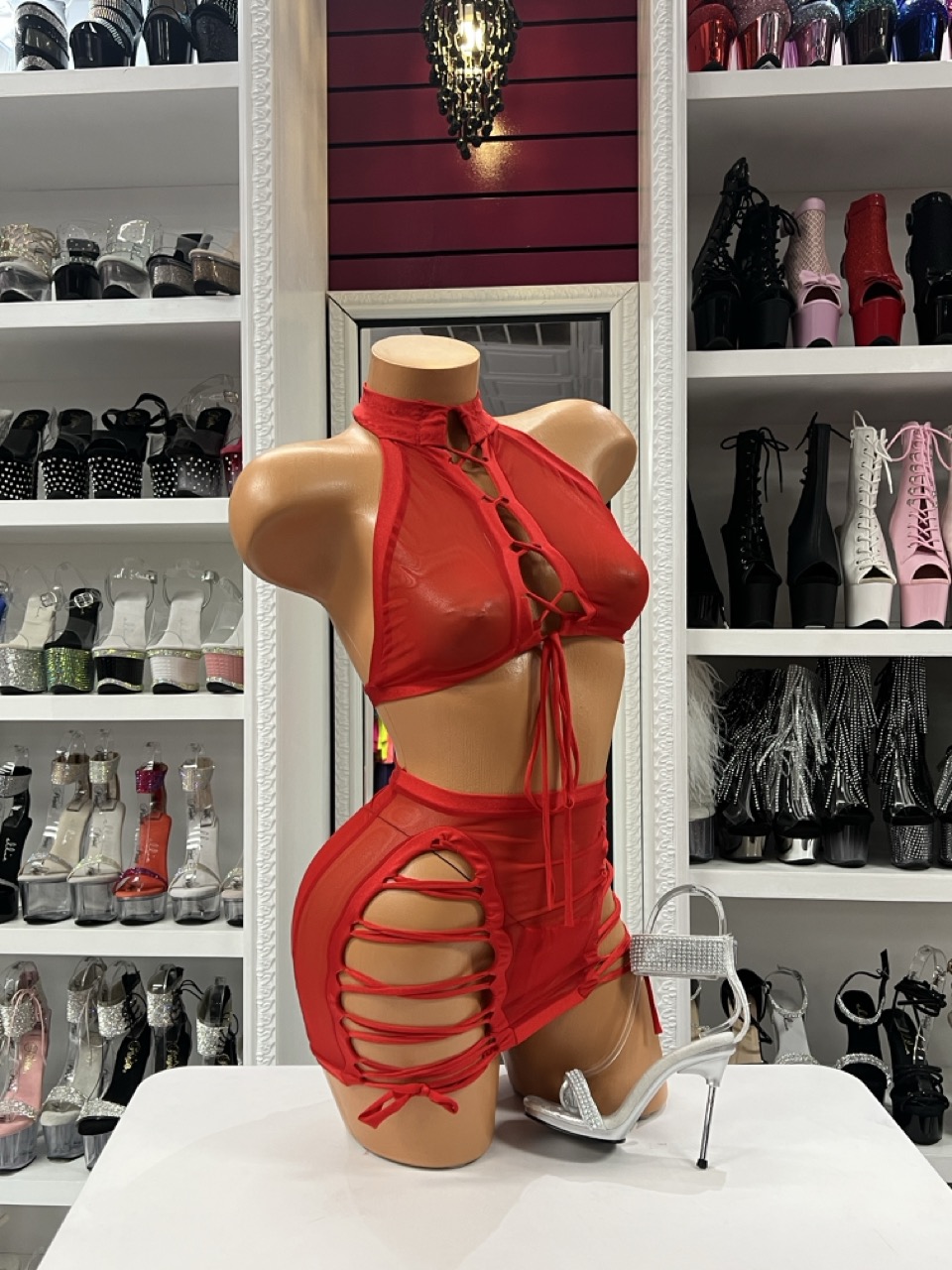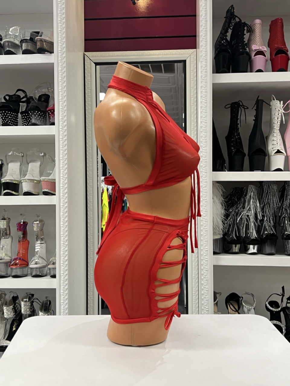 This sheer red halter and skirt set delivers bold confidence and flexible comfort. Designed for performers, it enhances curves while allowing full freedom of movement.