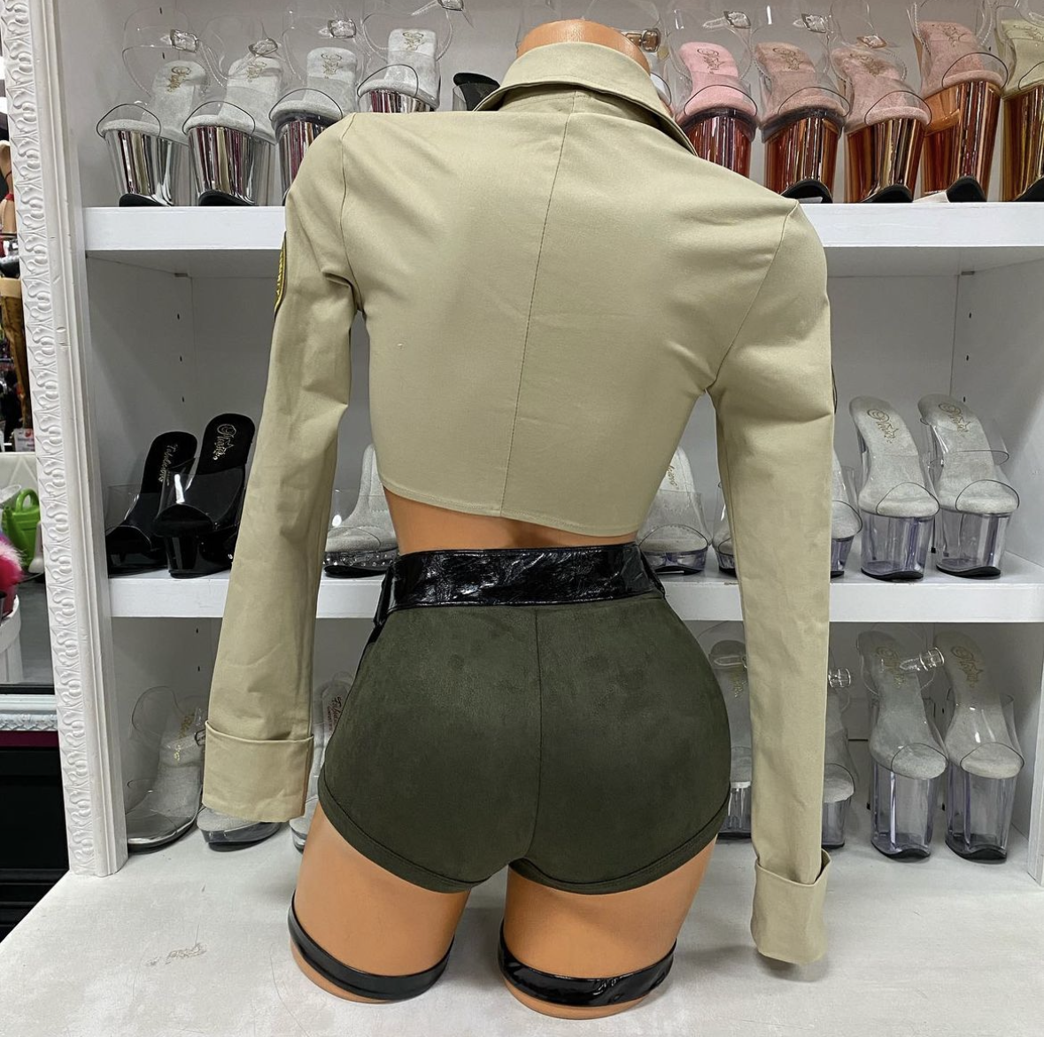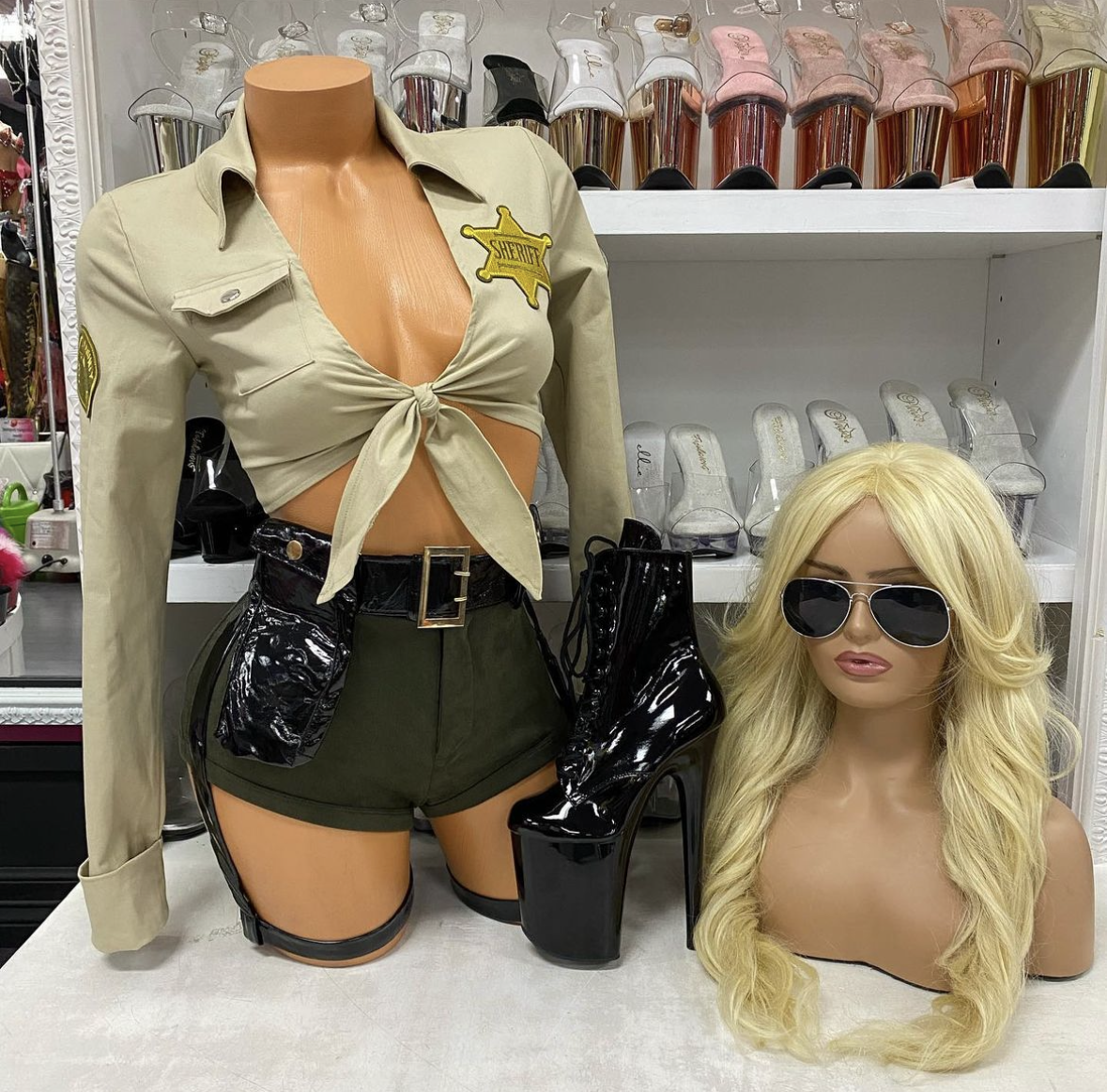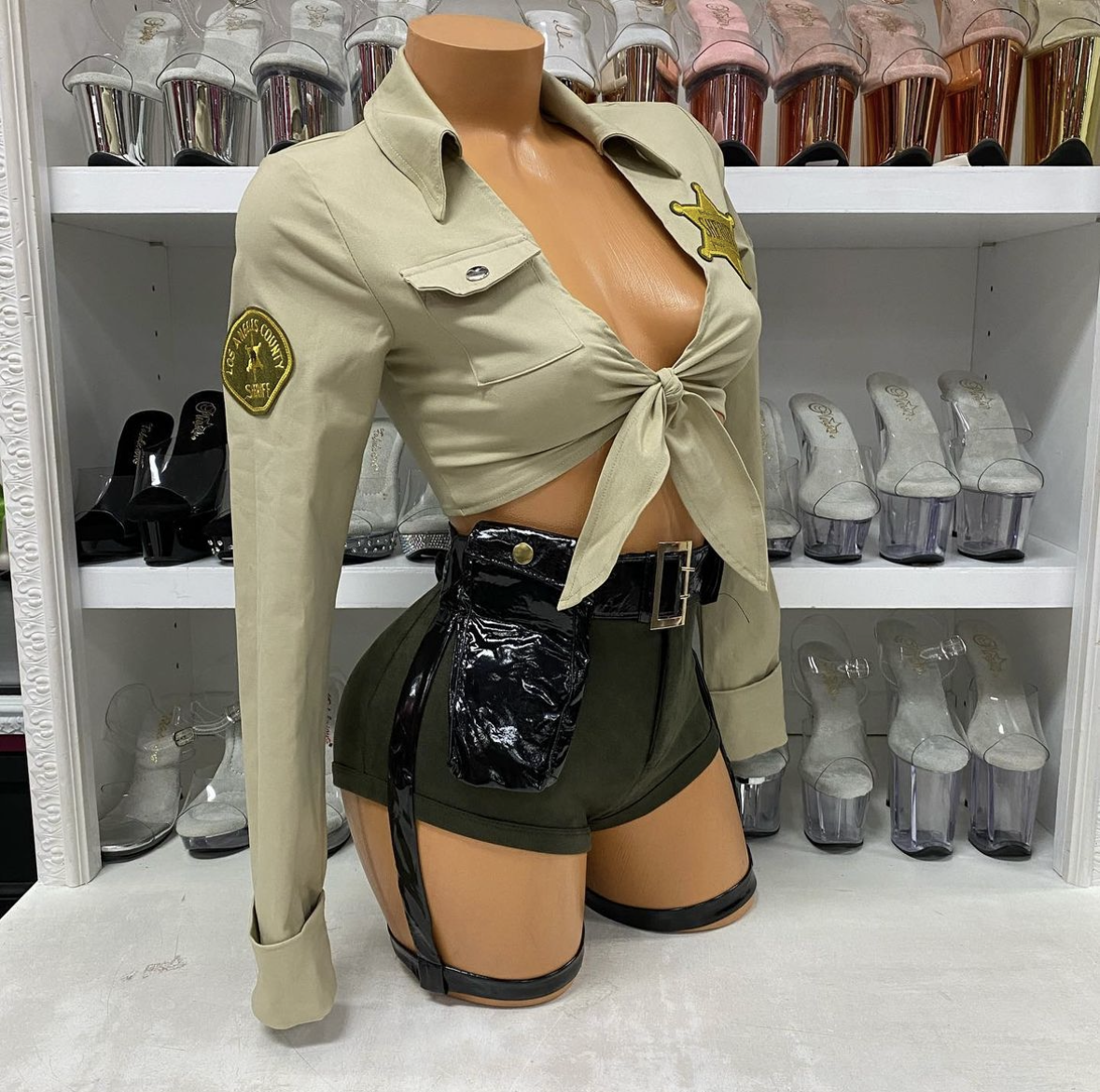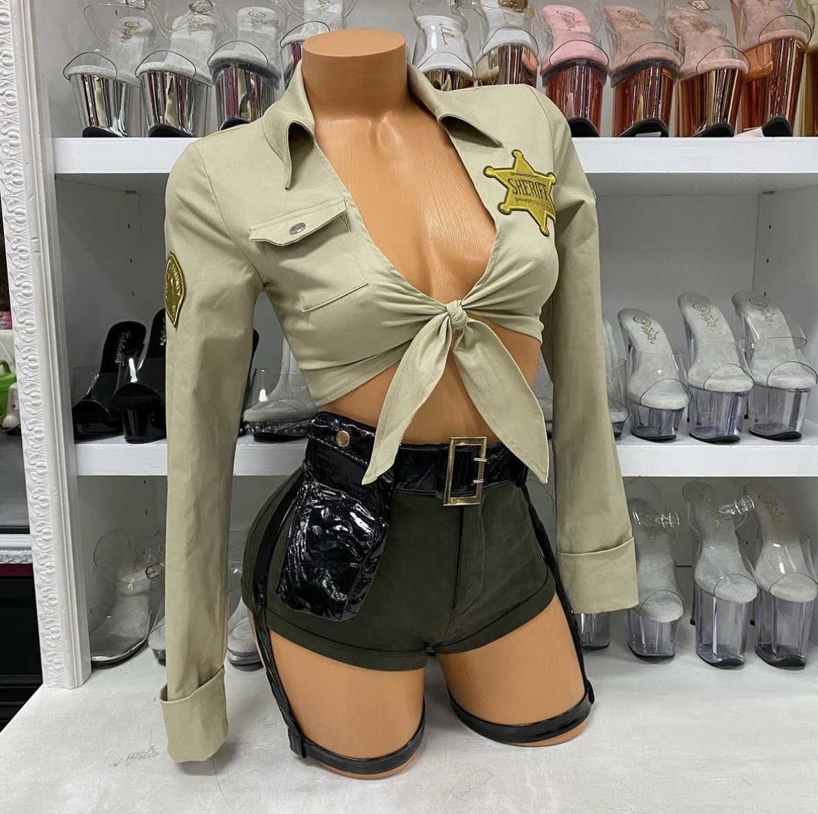 sheriff costume with tie-front crop top, olive shorts, and holsters displayed on mannequin