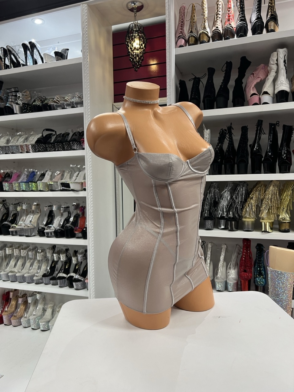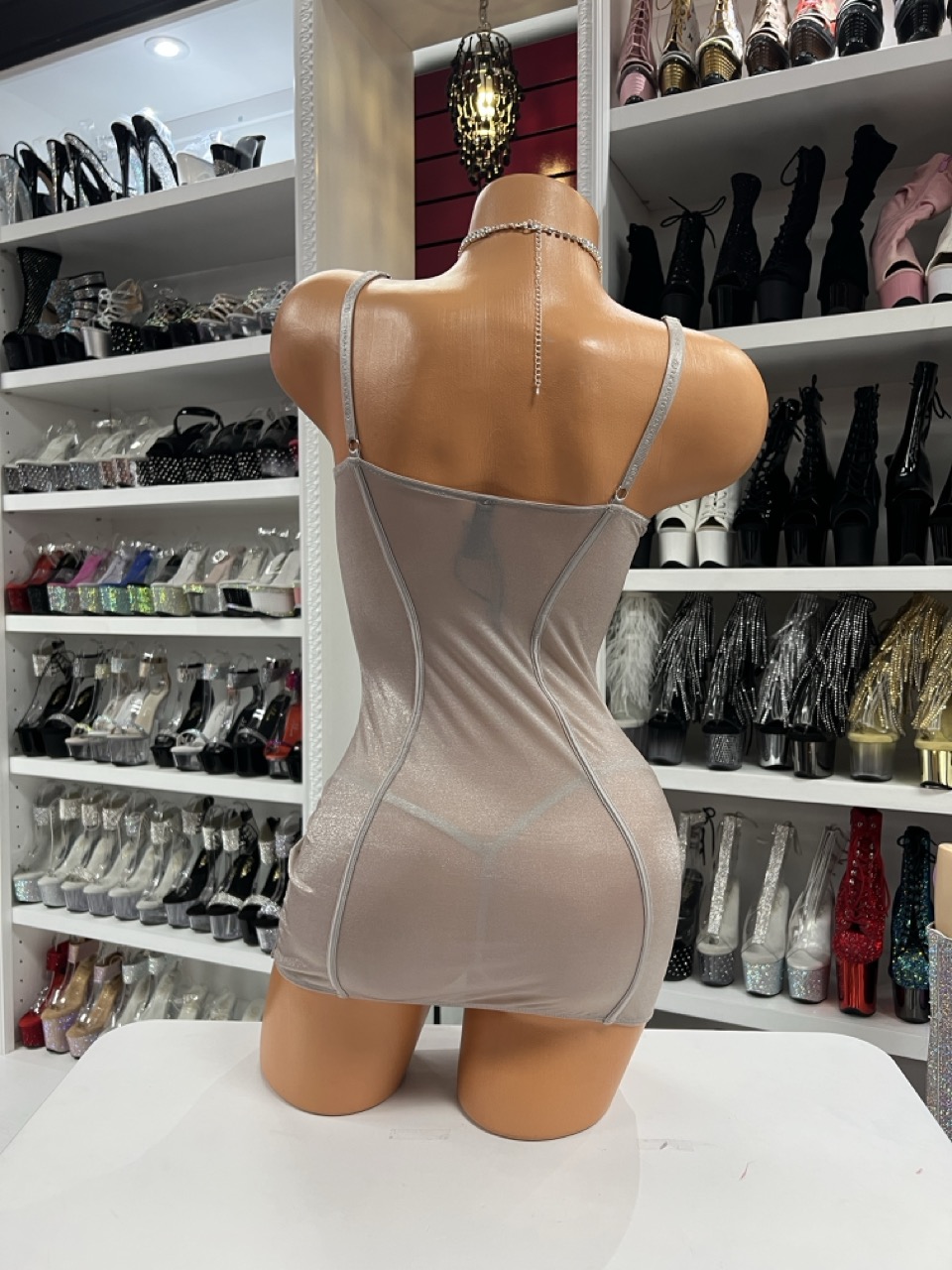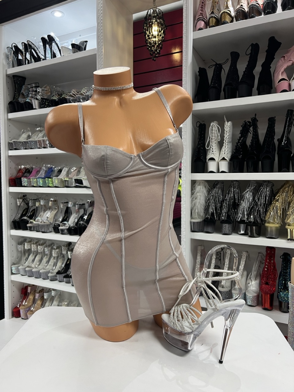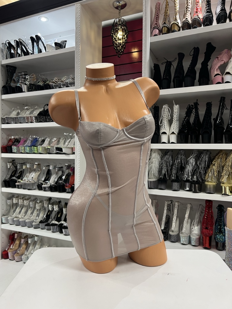 Shimmering silver bodycon dress with mesh panels, supportive cups, and a flexible performance fit. Sleek, elegant, and perfect for stage performers
