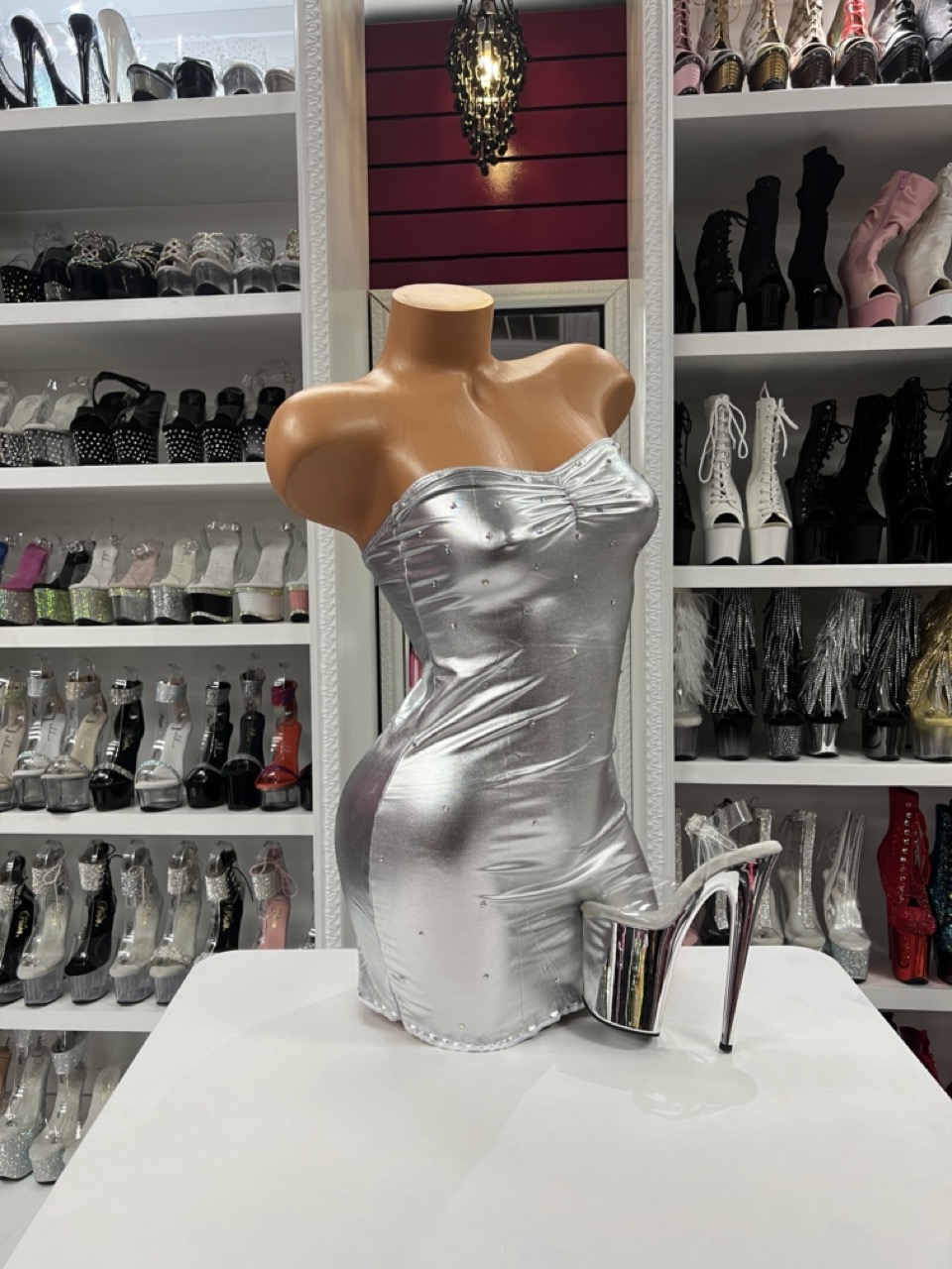 Silver strapless mini dress with a metallic finish and rhinestone accents. Designed for bold shine, confident movement, and standout stage style.