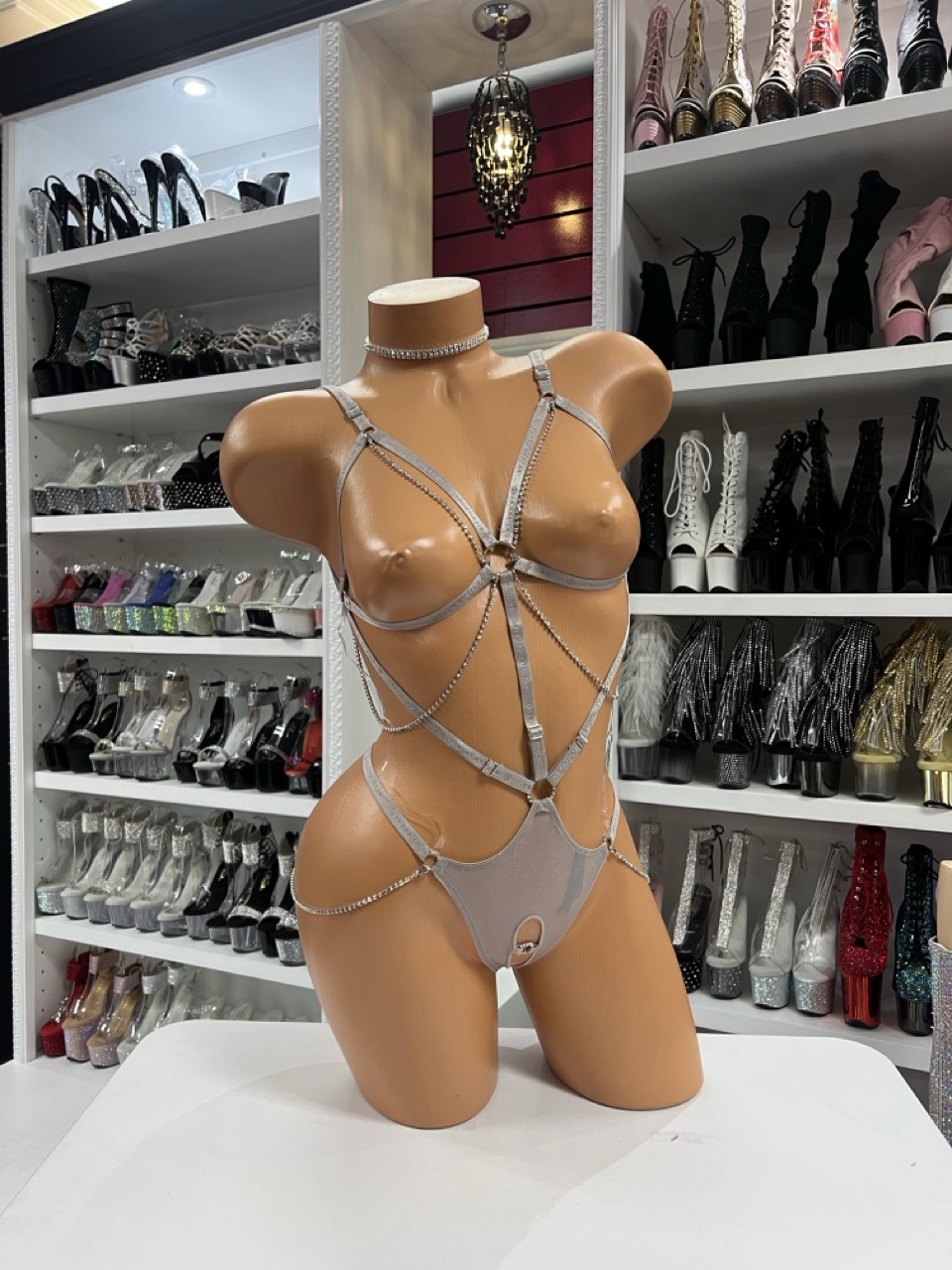 Shimmering silver strap bodysuit with crystal accents and flexible movement. Bold, lightweight, and perfect for high-impact stage looks.