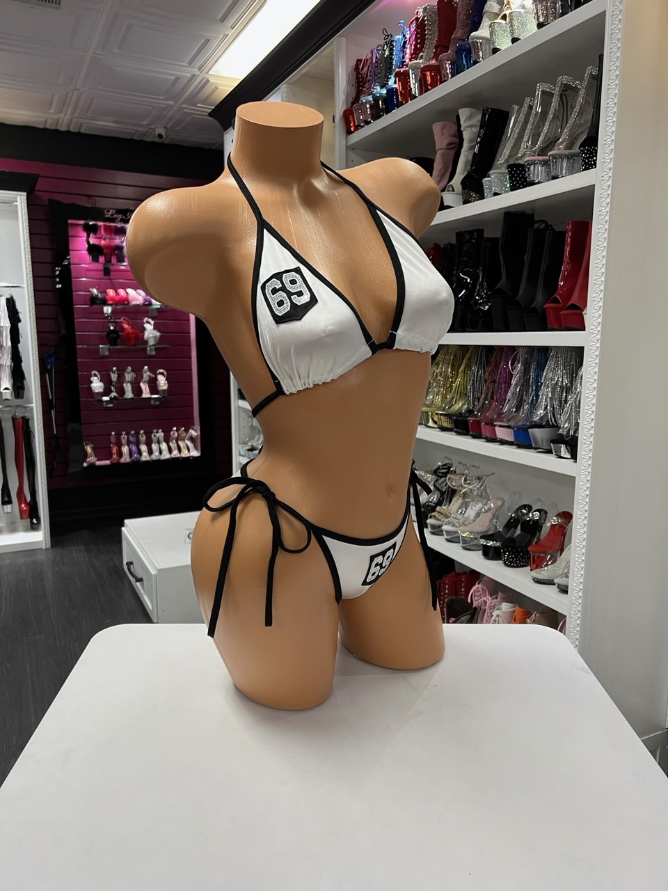 A sporty two-piece bikini set with adjustable top, tie-side bottoms, and bold number detail for confident stage movement and playful style.