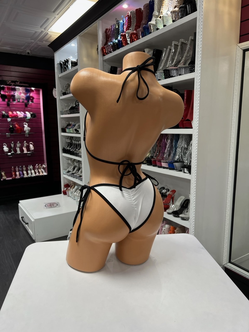 Sporty number bikini set with black trim and adjustable halter top displayed on mannequin