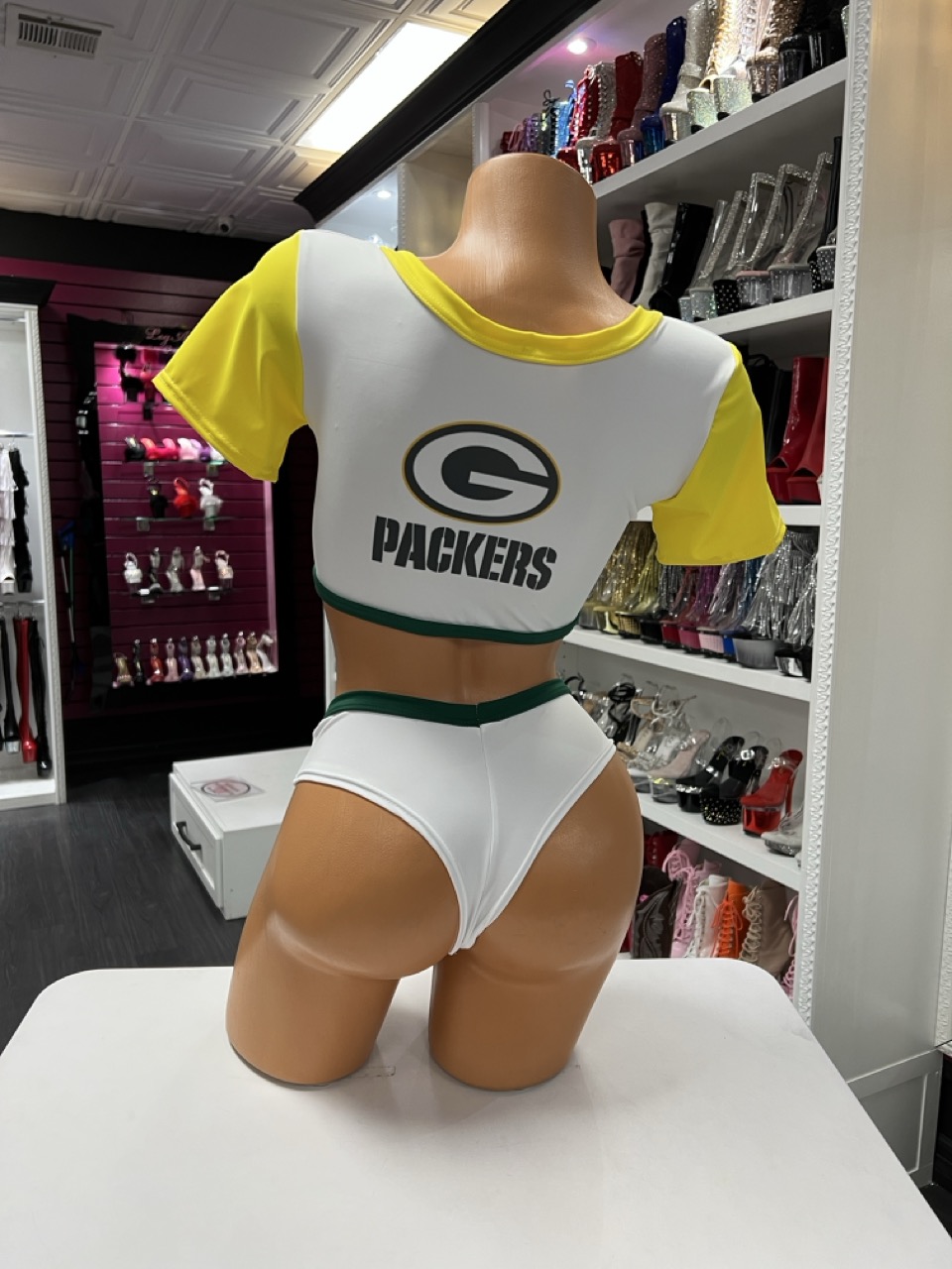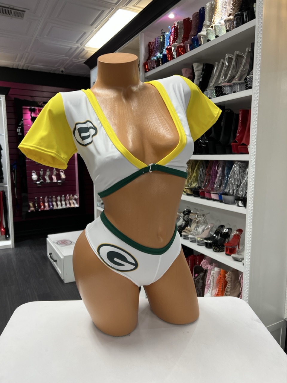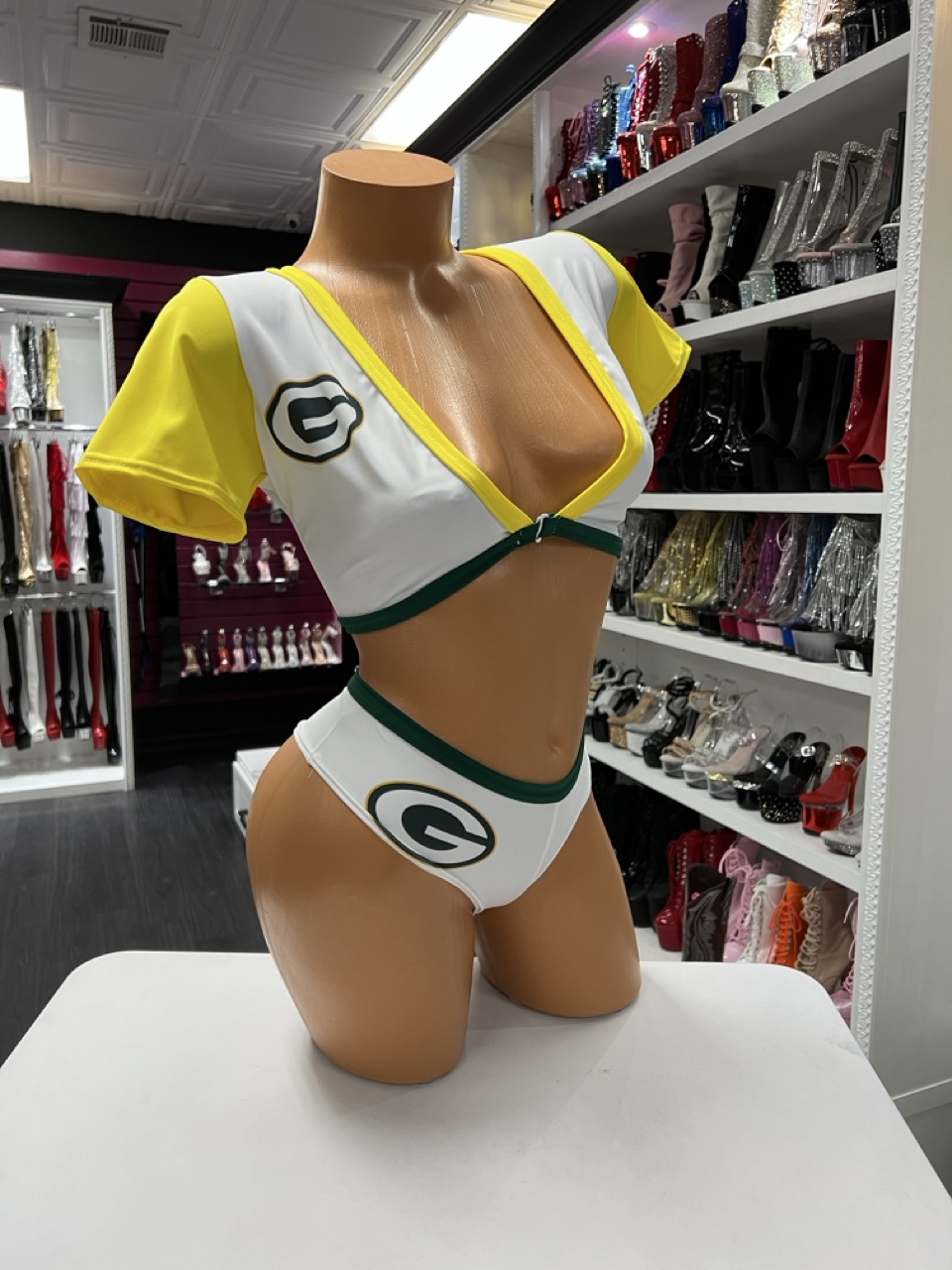 Sporty v neck set with contrast trim crop top and high cut bottoms on mannequin