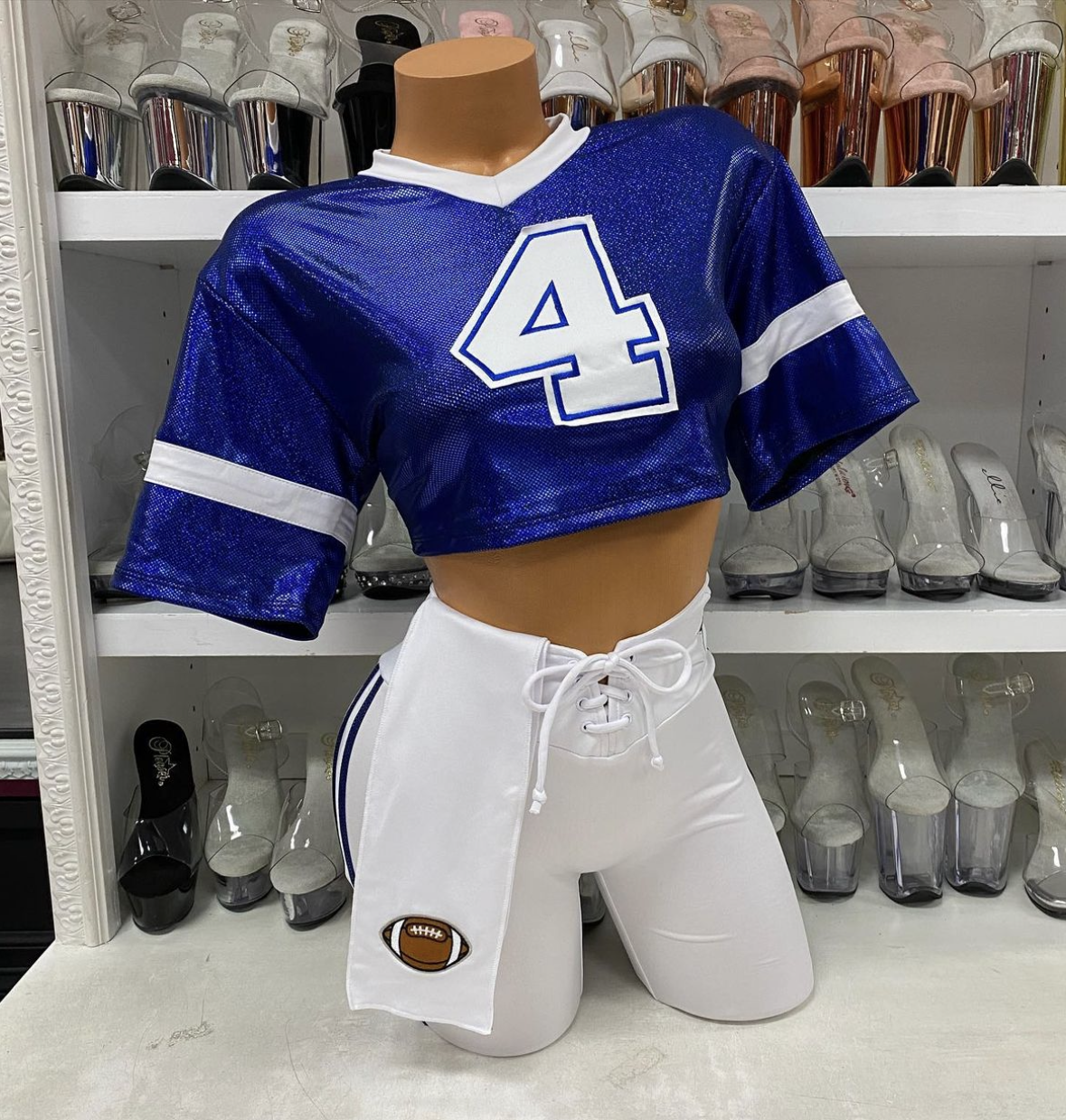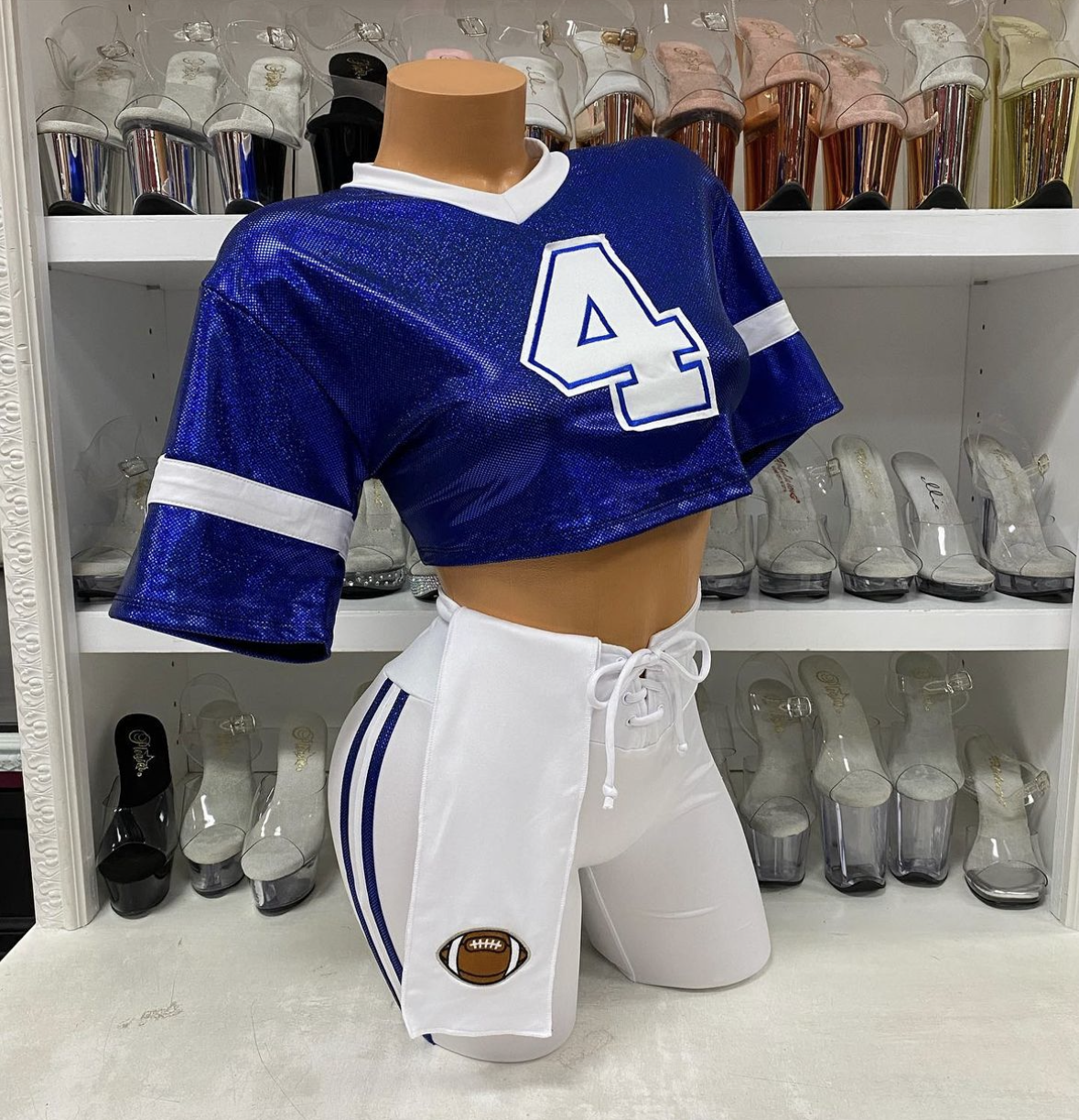 5-piece sexy football player costume features cropped jersey with embroidered number 4″ at center and star print on sleeves paired with matching lace-up biker shorts and towel accessory with ornamental football patch and fingerless gloves and football shaped bag. No returns or exchanges.