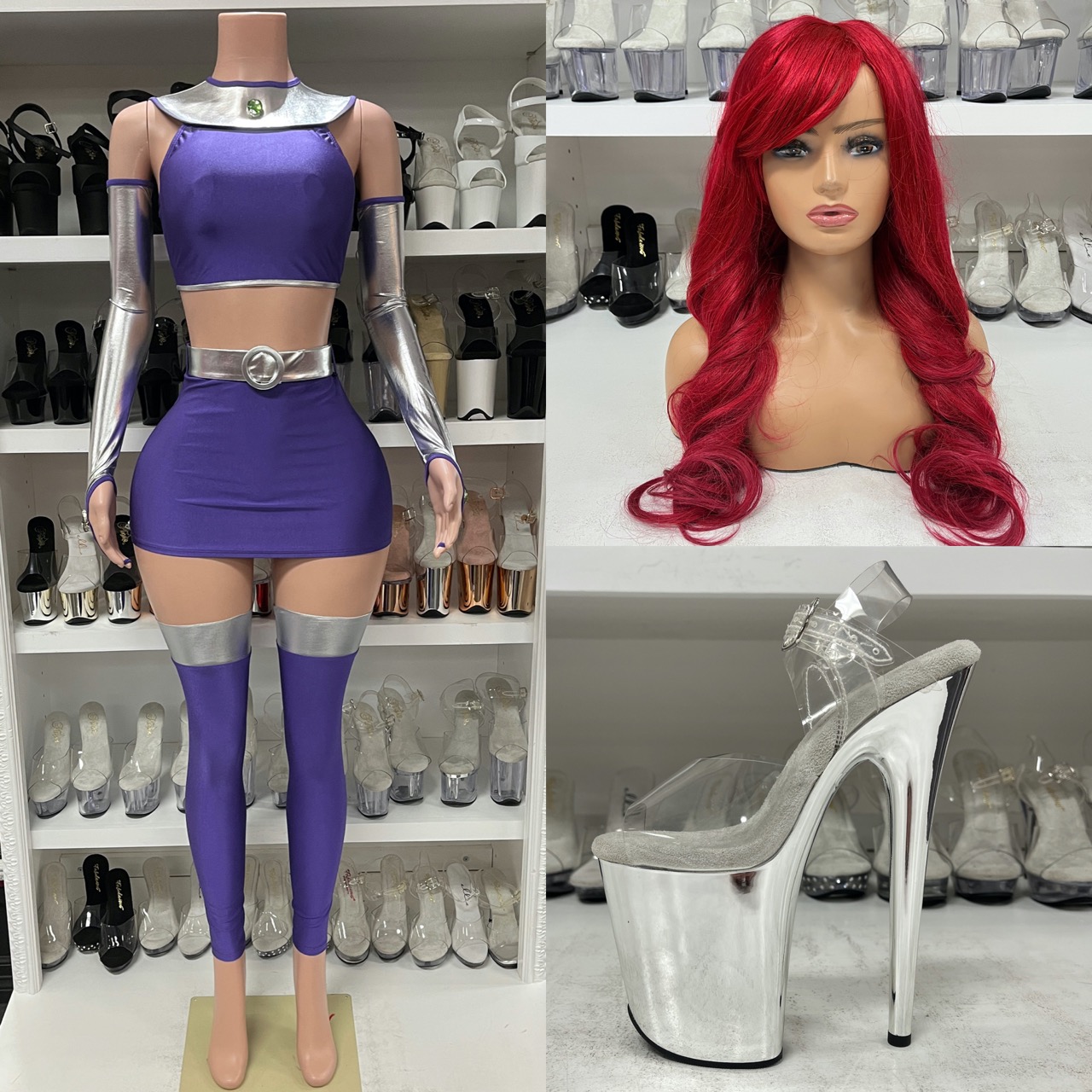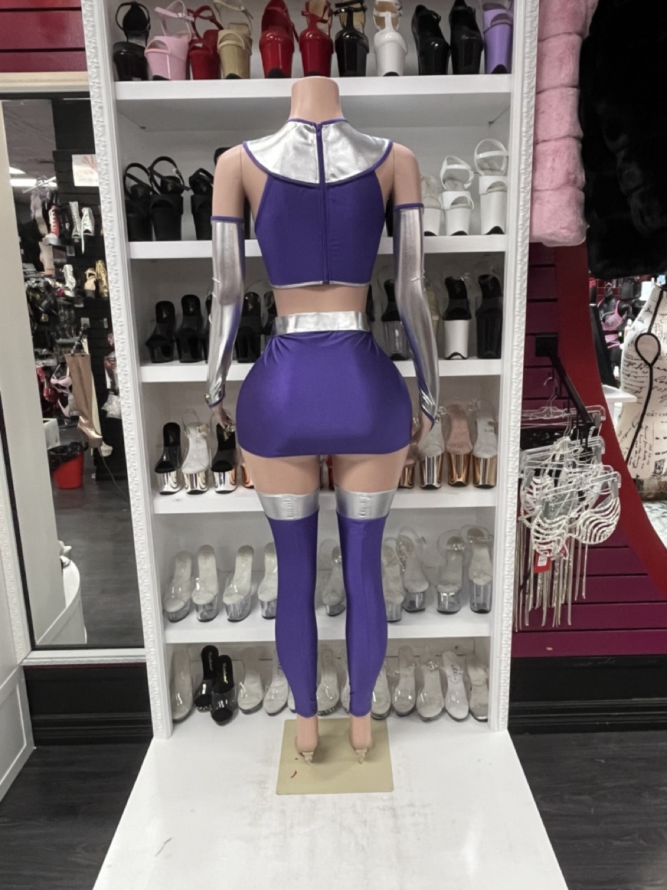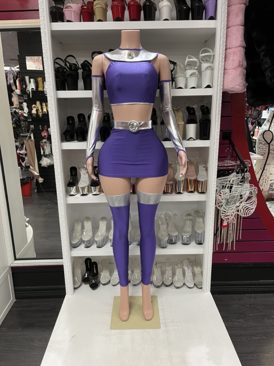 Star Princess Costume includes purple crop top, skirt, silver belt, gloves, and thigh-high leg accessories. A cosmic, futuristic showpiece.