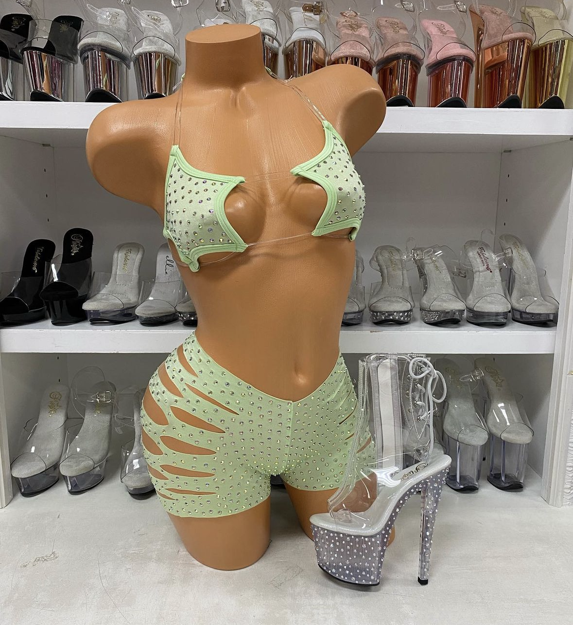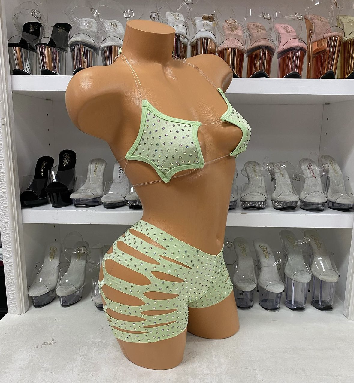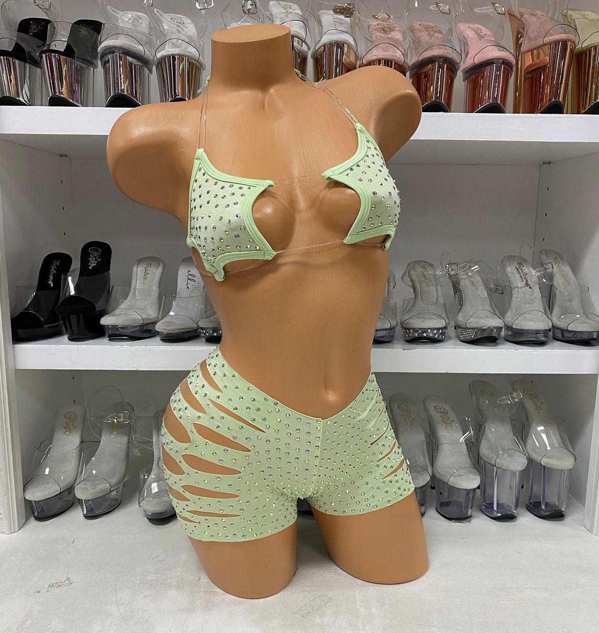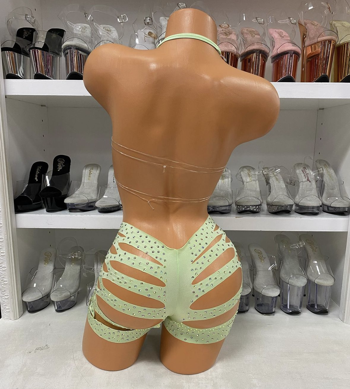 This gorgeous two-piece set includes a star-printed crop top with strategic cutouts and matching high-waisted shorts with side detail cutouts. The fresh light green color and celestial pattern create an enchanting look perfect for making a statement. The coordinating pieces can be worn together or styled separately for maximum versatility. One size fits most. No returns/exchanges.
