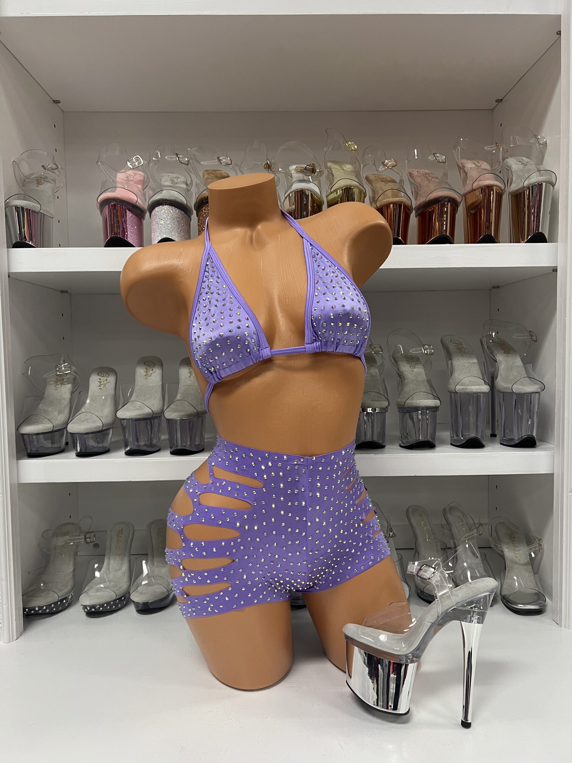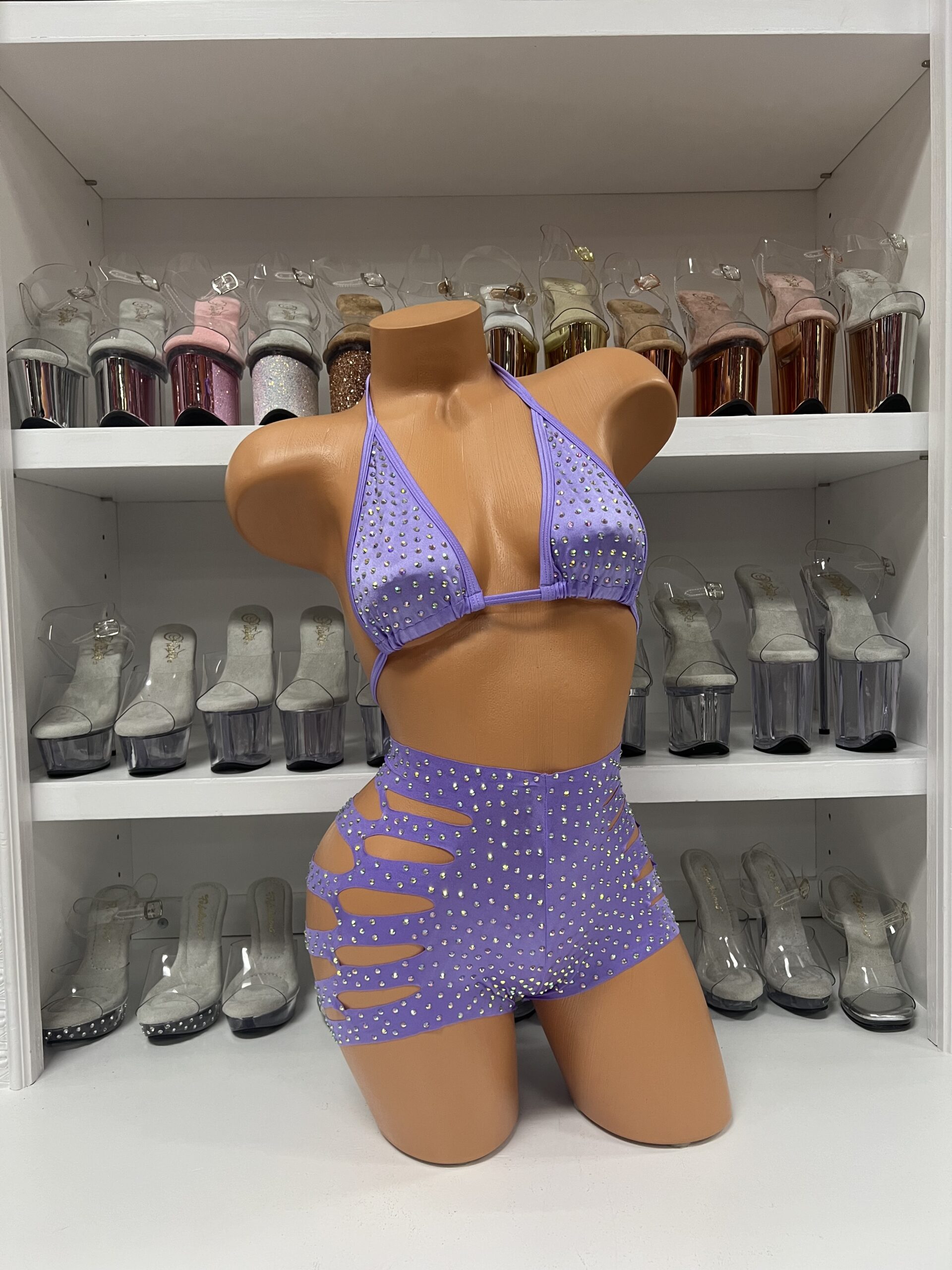 This gorgeous two-piece set includes a star-printed crop top with strategic cutouts and matching high-waisted shorts with side detail cutouts. The dreamy lilac color and celestial pattern create an enchanting look perfect for making a statement. The coordinating pieces can be worn together or styled separately for maximum versatility. One size fits most. No returns/exchanges.