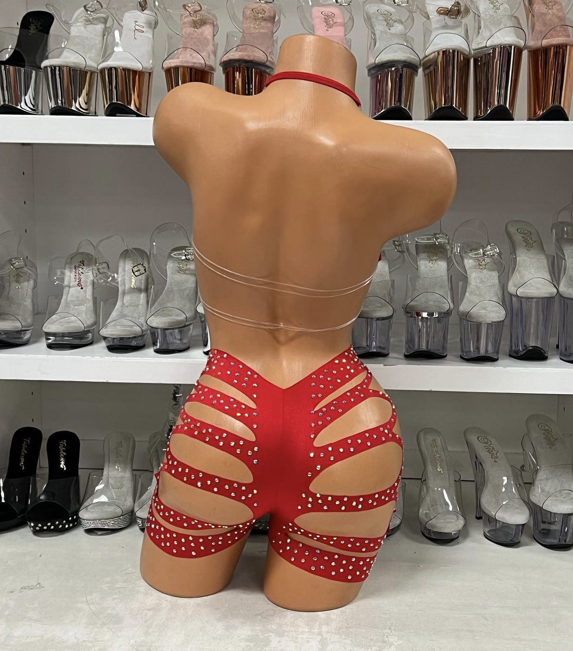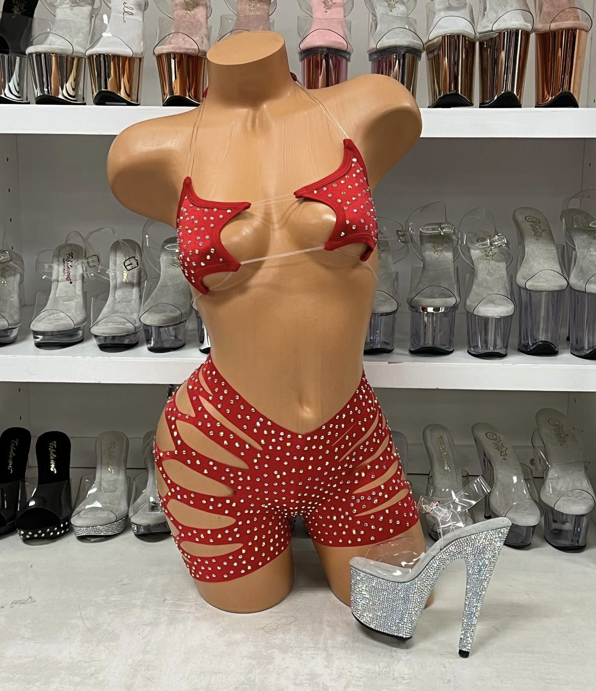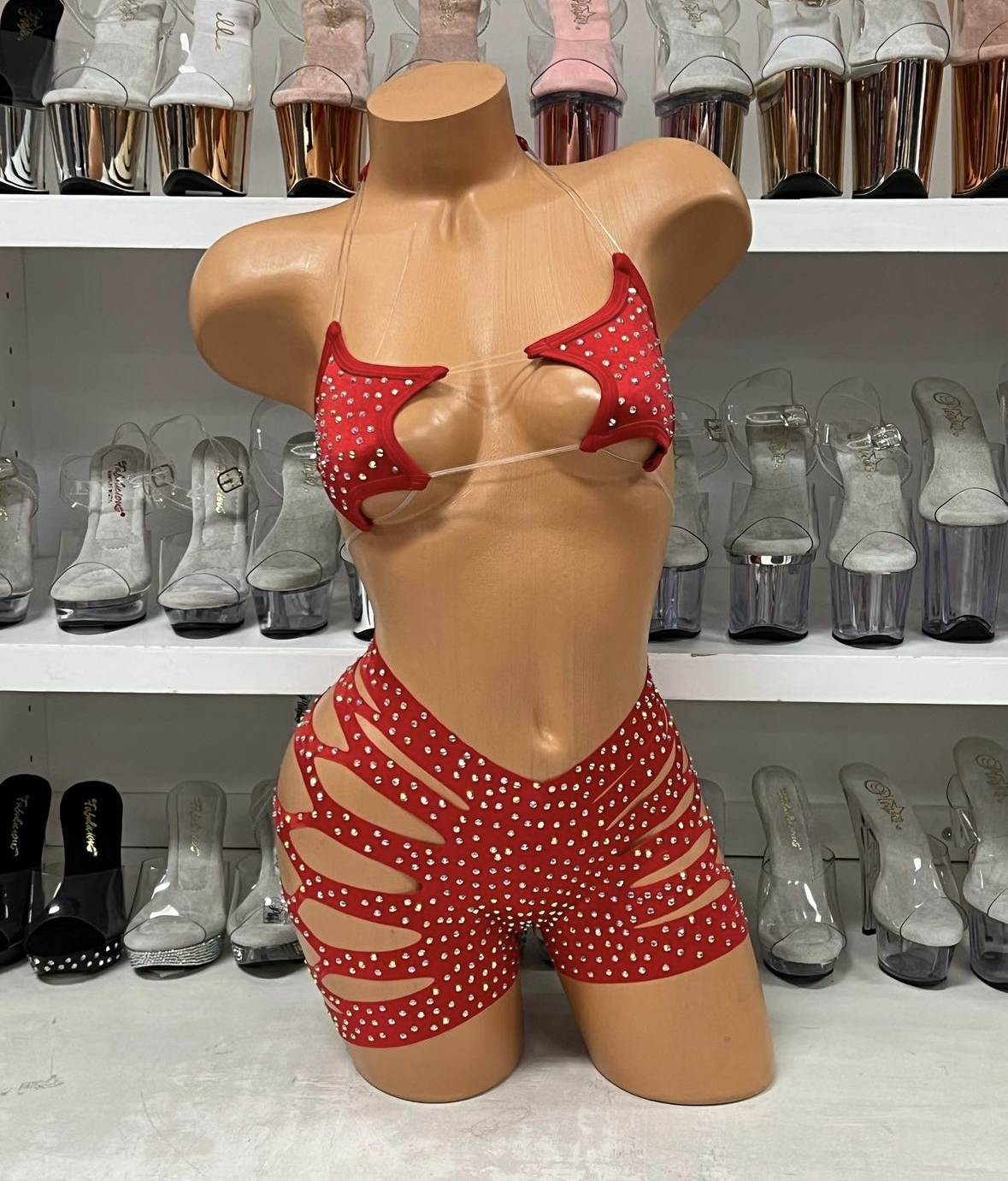 This gorgeous two-piece set includes a star-printed crop top with strategic cutouts and matching high-waisted shorts with side detail cutouts. The bold red color and celestial pattern create an enchanting look perfect for making a statement. The coordinating pieces can be worn together or styled separately for maximum versatility. One size fits most. No returns/exchanges.