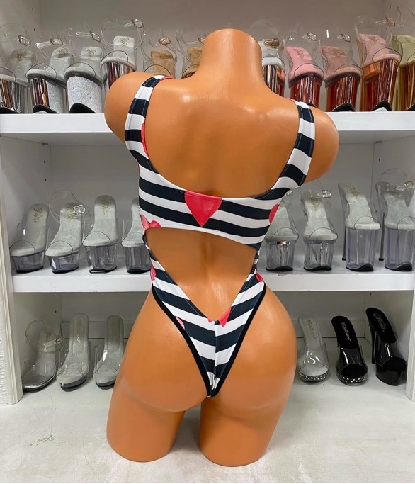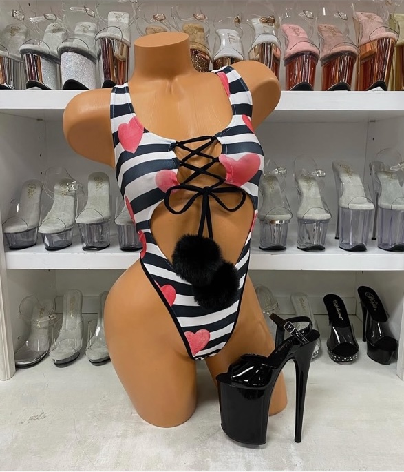 Striped heart lace bodysuit with adjustable black lace-up front and pom detail. Bold contrast meets playful stage-ready styling.