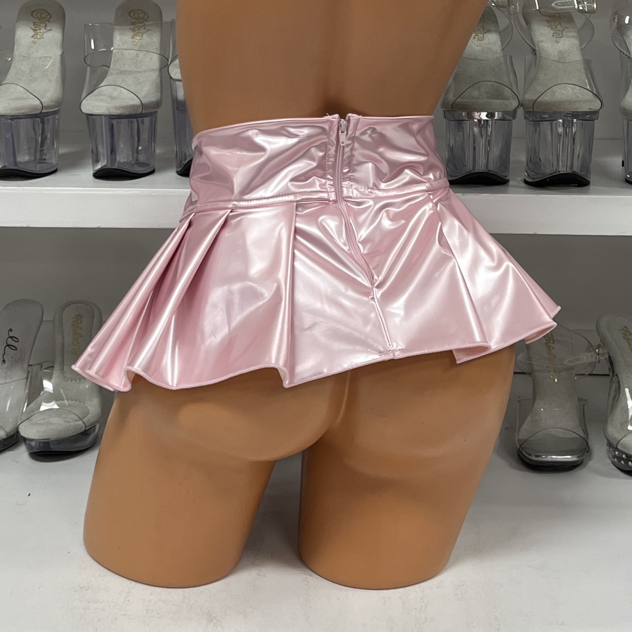 This dreamy baby pink vinyl skirt features a secure side zipper closure and high-waisted pleated design for the perfect fit. The glossy vinyl material catches light beautifully while the expert pleating creates gorgeous movement. Style it sweet or sultry – this versatile piece transitions effortlessly from day to night looks. One size fits most. No returns/exchanges.