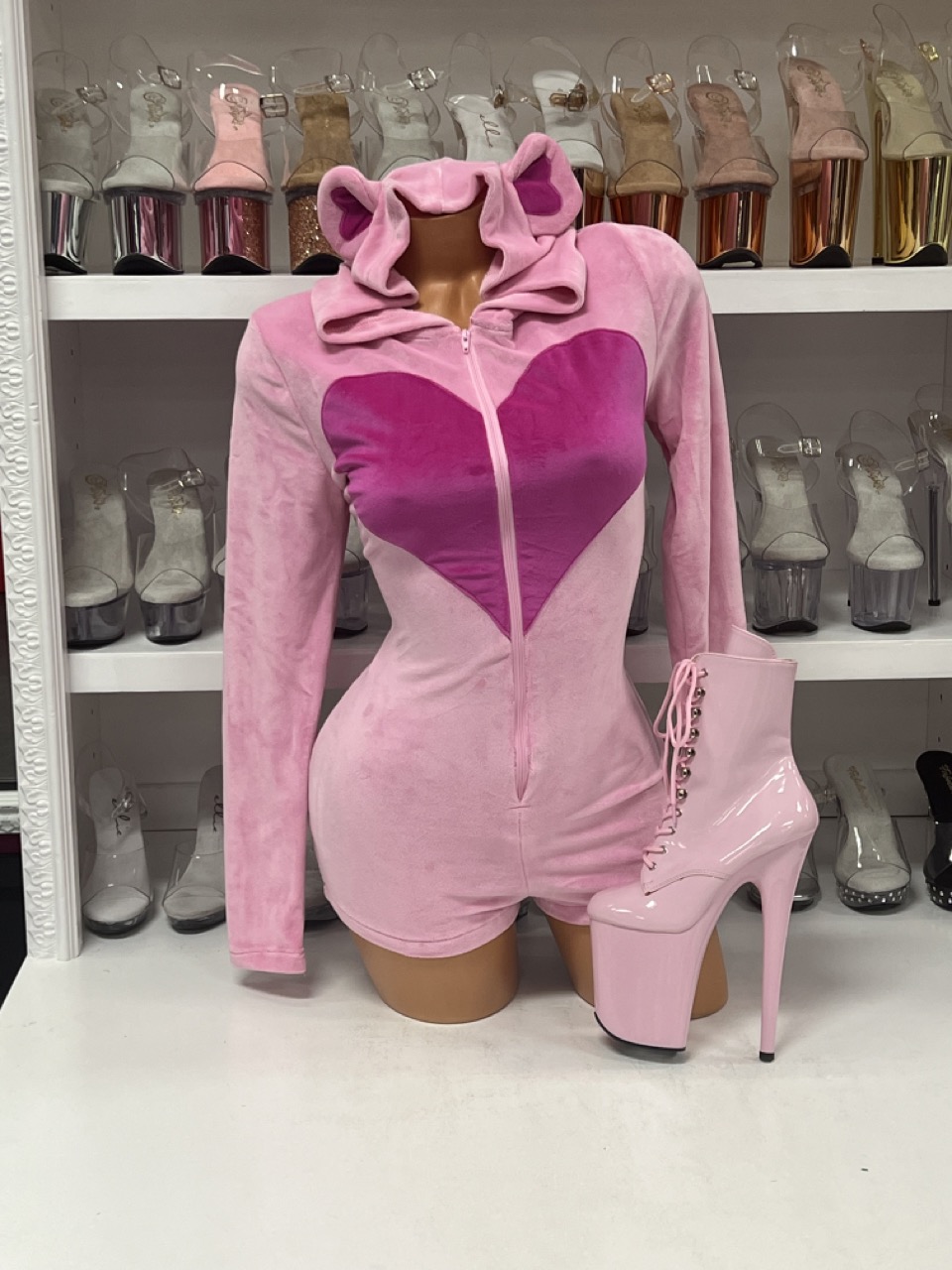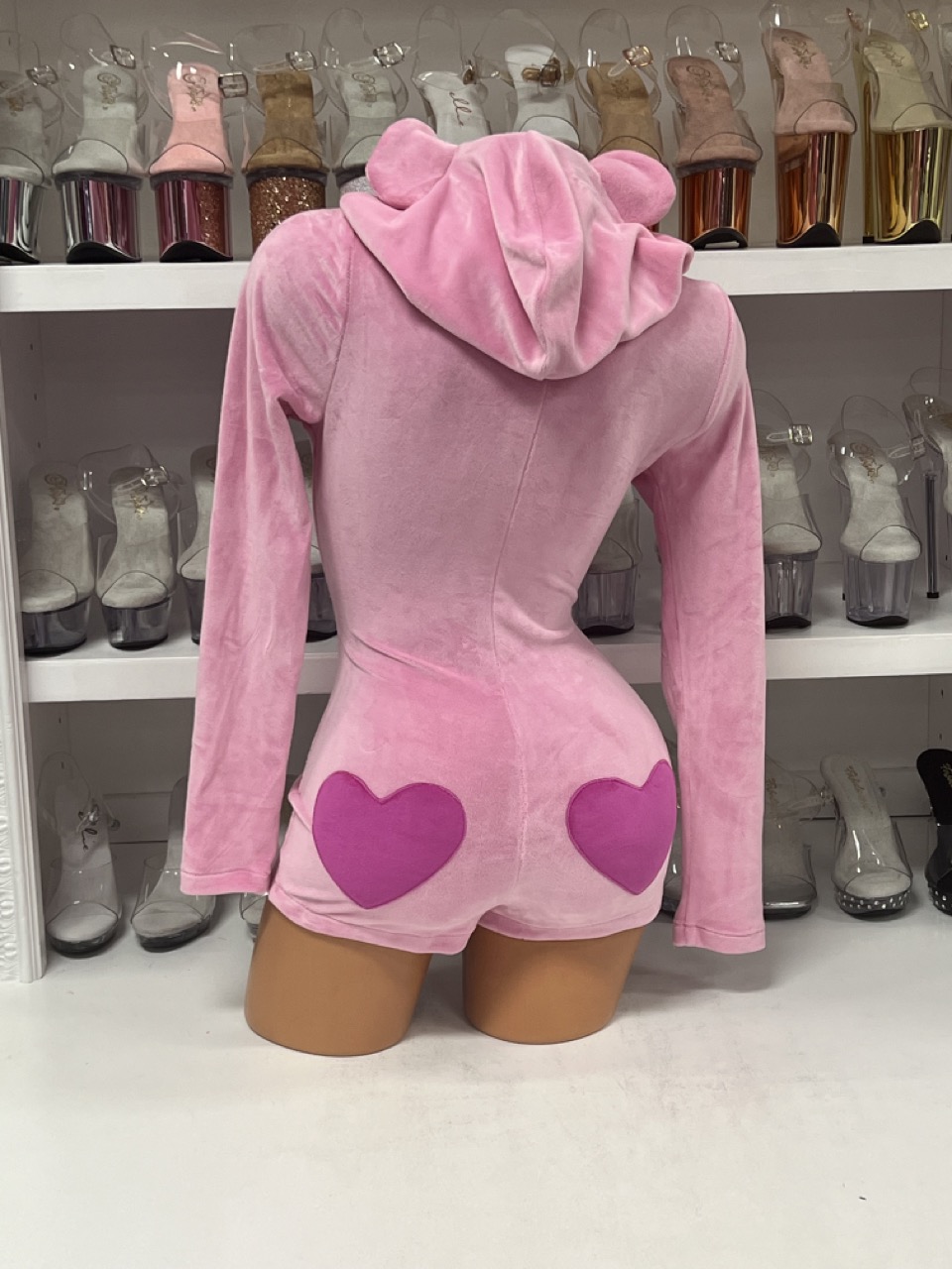 Want to glam it up? Pair this velvet romper with our pink lace-up platform boots for a head-to-toe pastel moment. You can also layer it over thigh-high socks or go full bear mode with a fuzzy backpack and glossy lip. However you style it, this piece makes a statement without trying too hard.