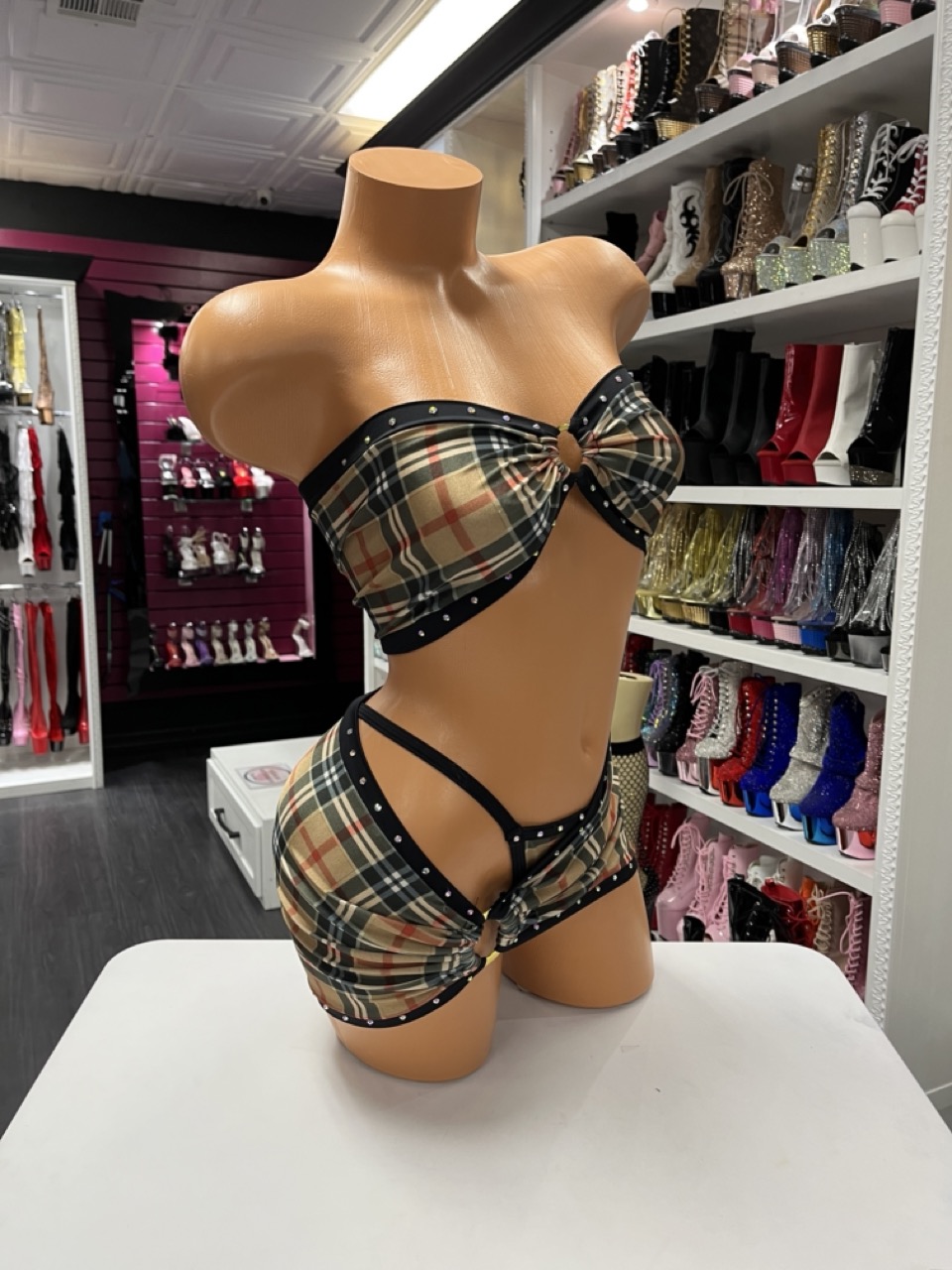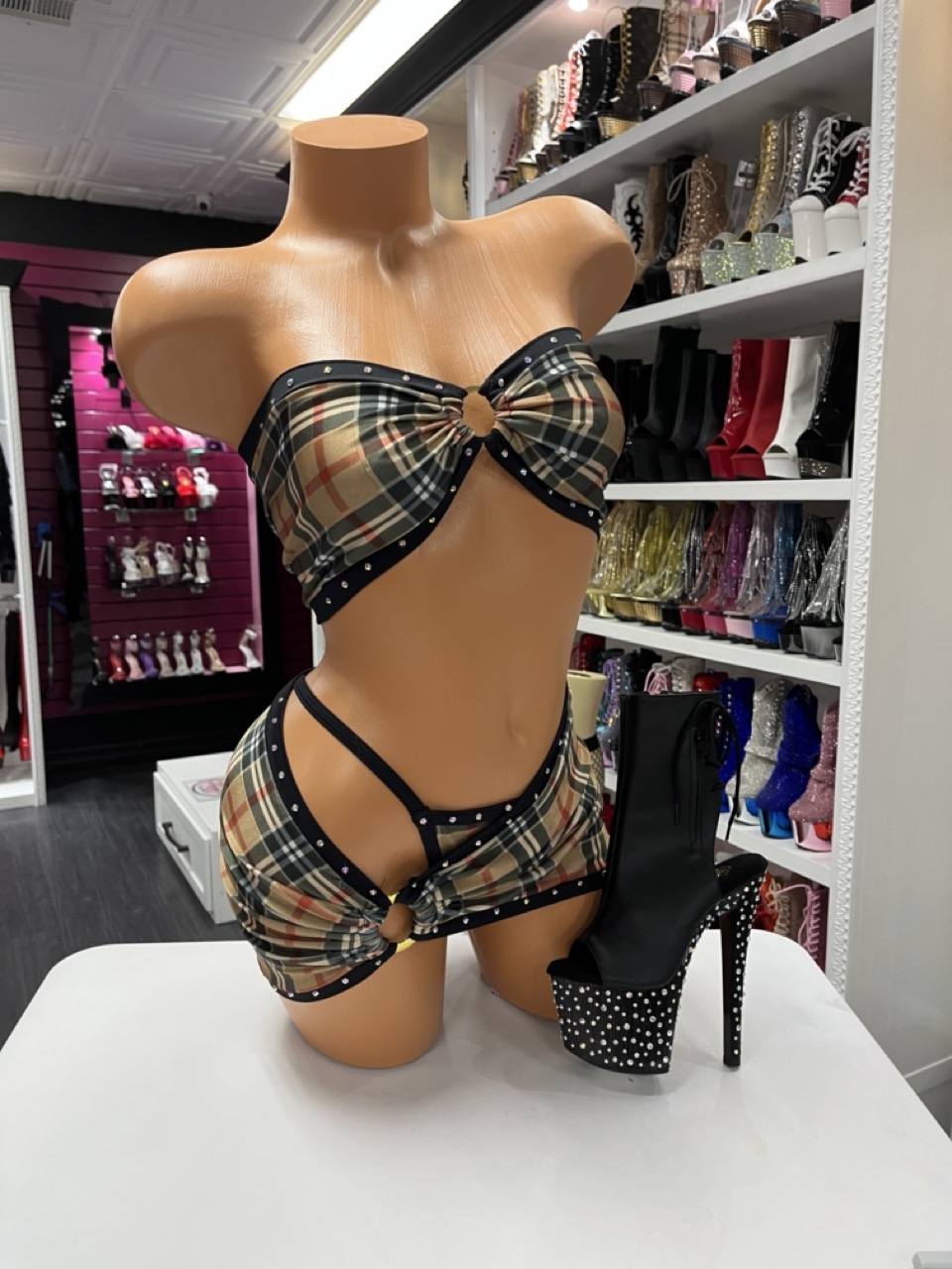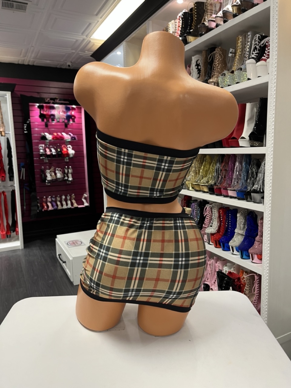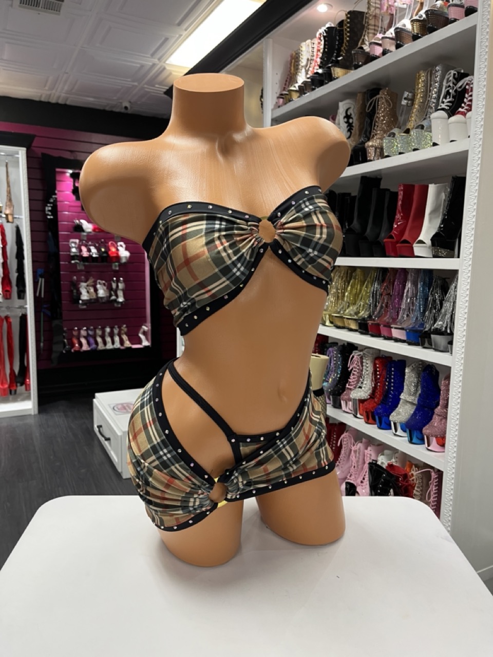 Tan plaid two-piece set with ring details and a curve-hugging fit. Designed for bold stage looks and confident movement.