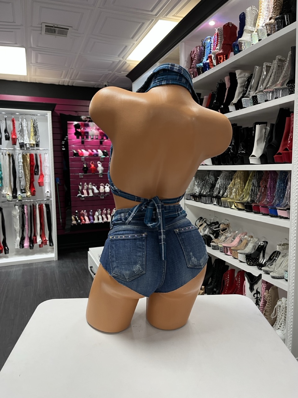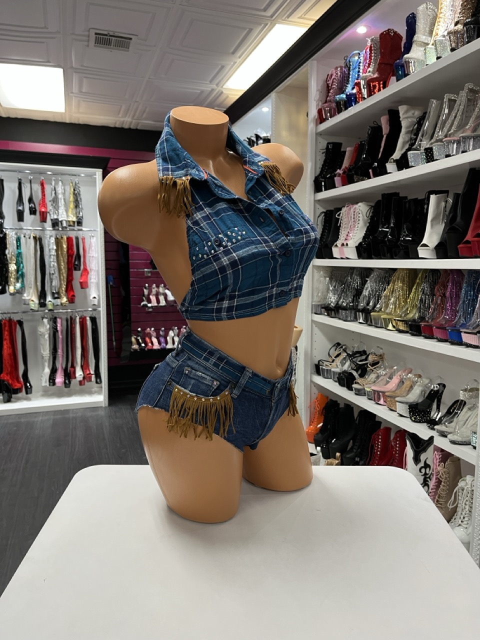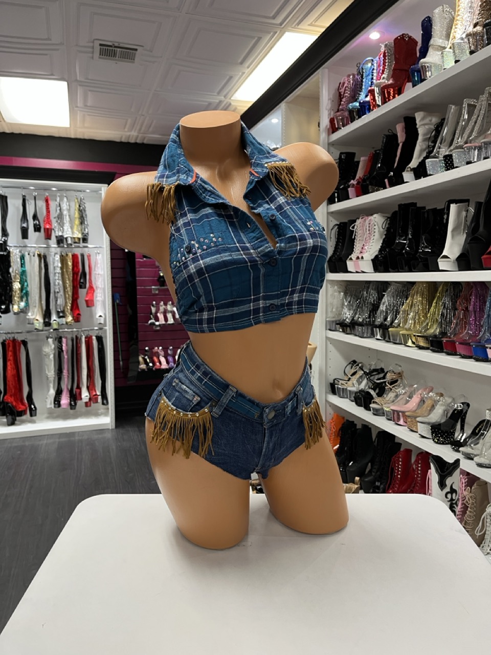 Teal plaid short set with cropped halter top and fringe denim shorts cowgirl outfit