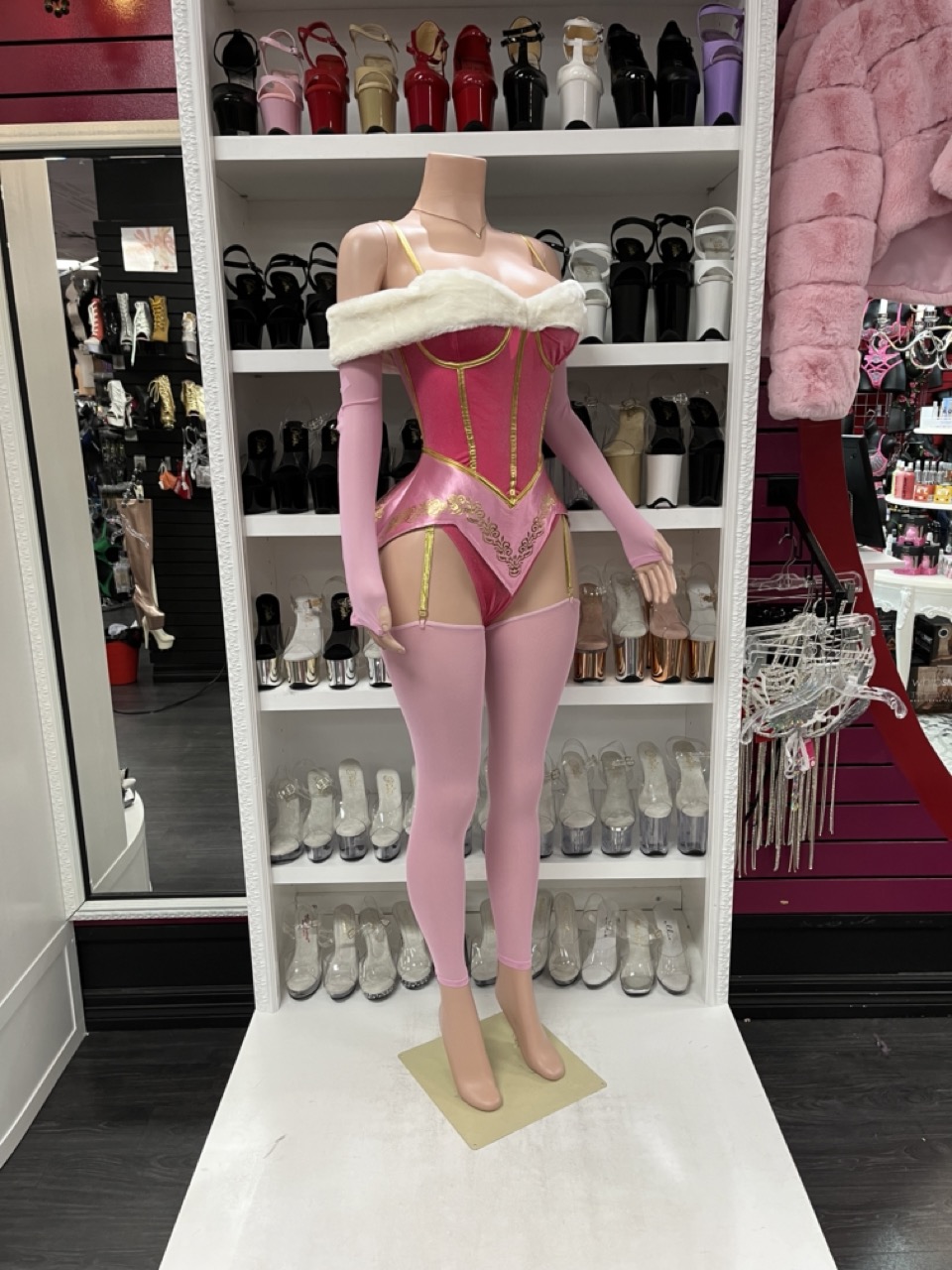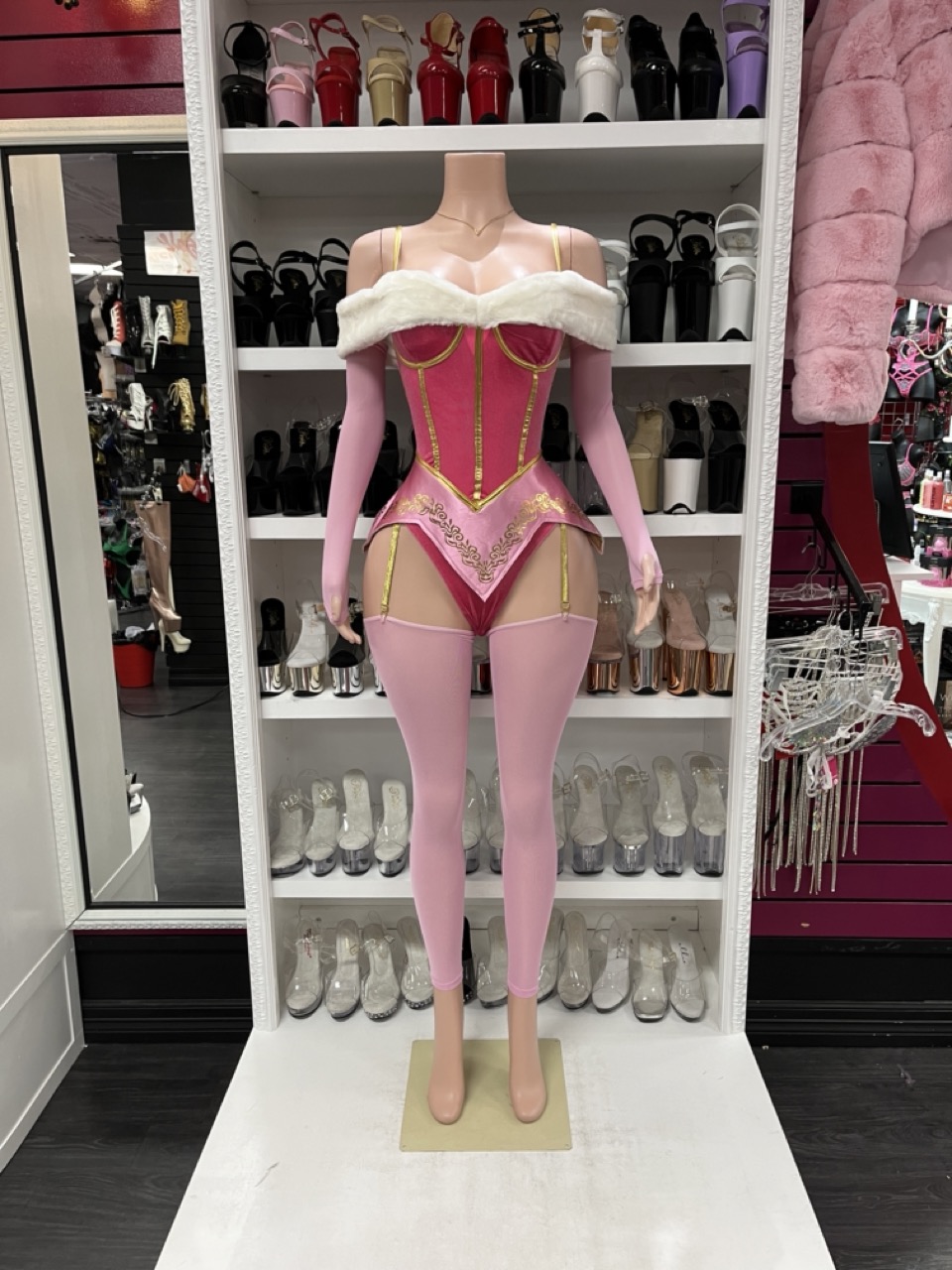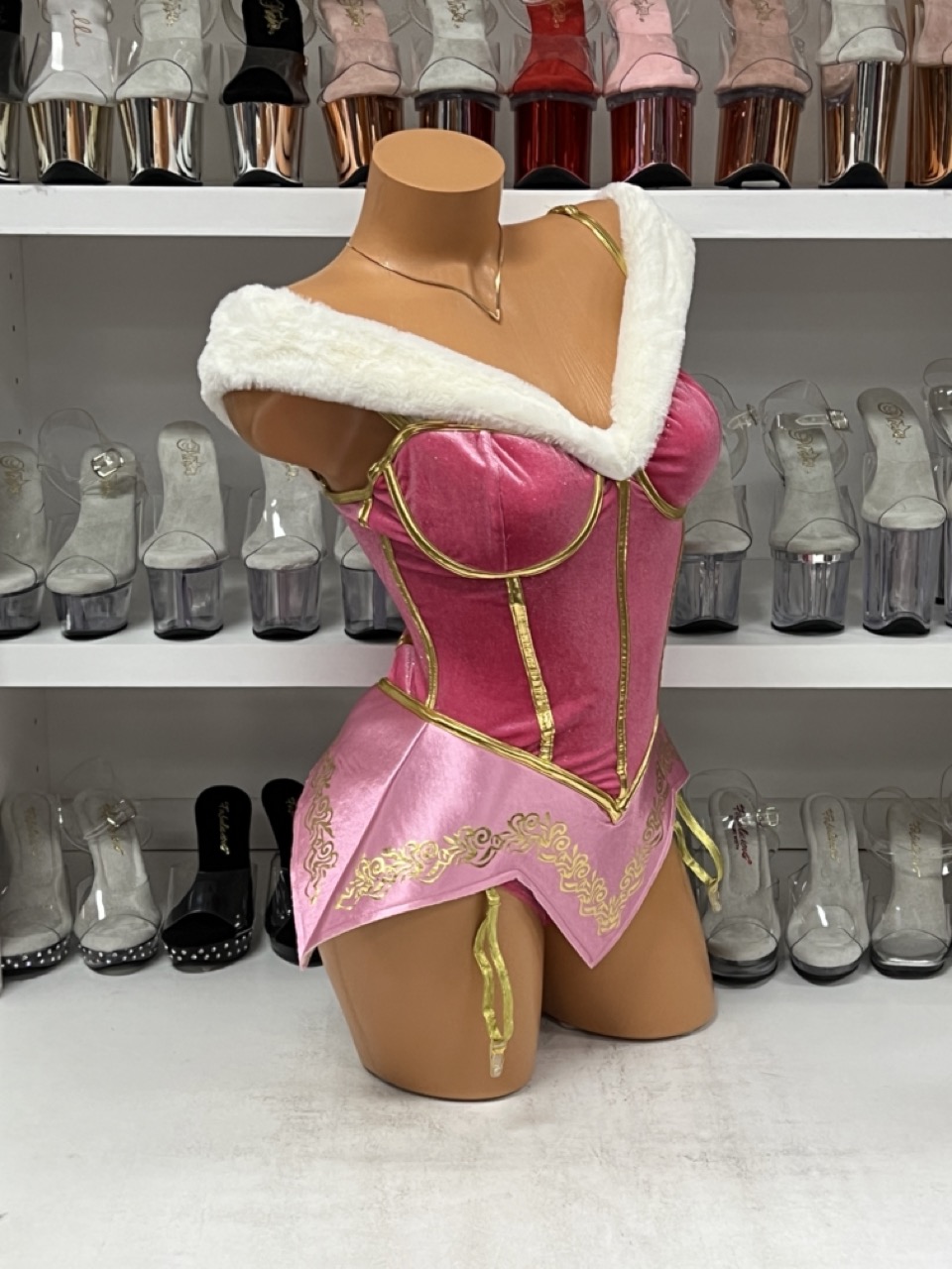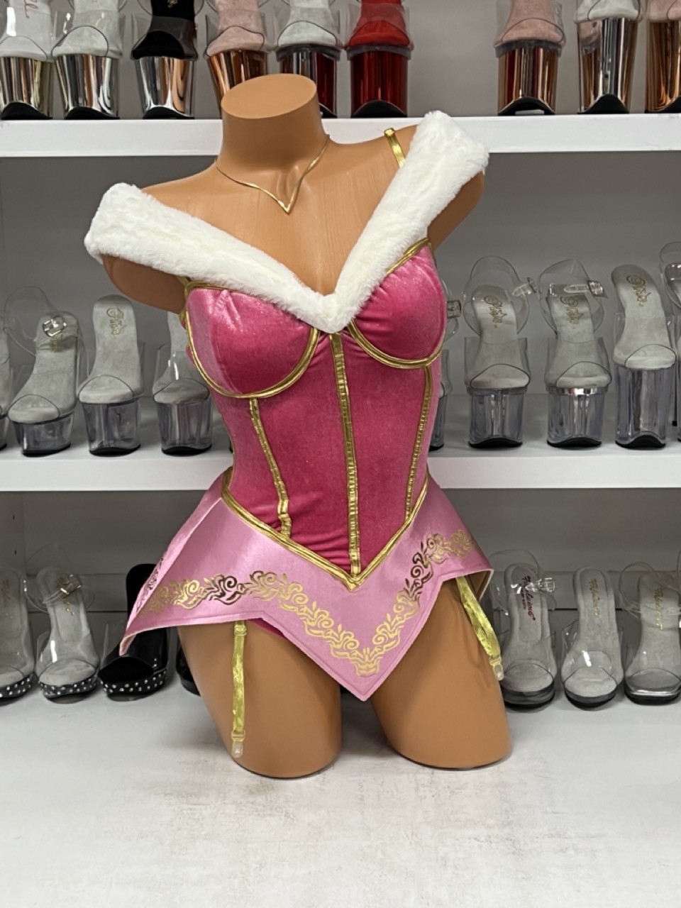True Loves Kiss Costume with satin pink bodysuit, faux fur trim, garter straps, gloves, crown headband, and necklace. A royal fairytale look.