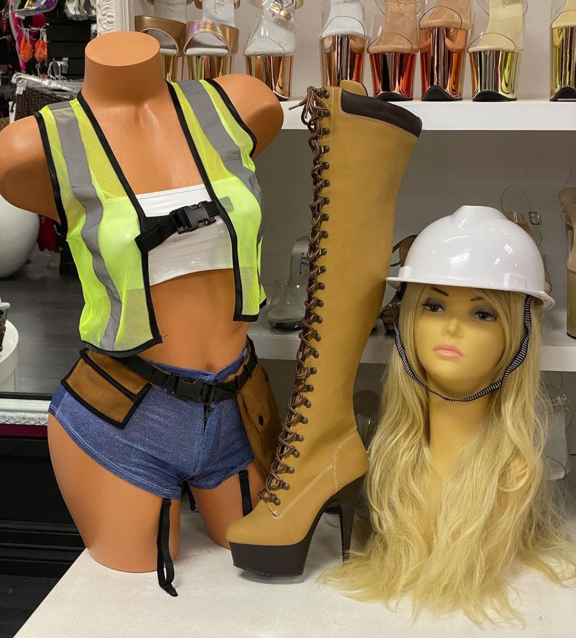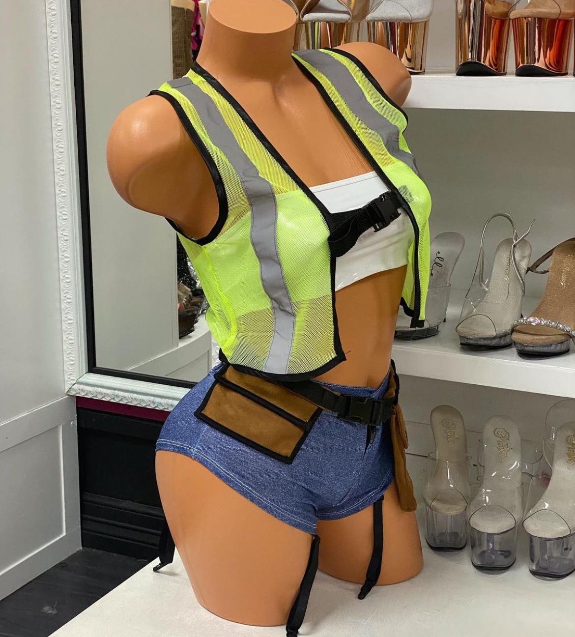 6pc. Sexy Construction Worker Costume features solid vinyl cami top paired with denim print panty bottoms with attached garters and a fluorescent yellow mesh cropped with buckle front closure along with a matching belt with functional pouches and fingerless gloves topped off with clear glasses. No returns or exchanges.