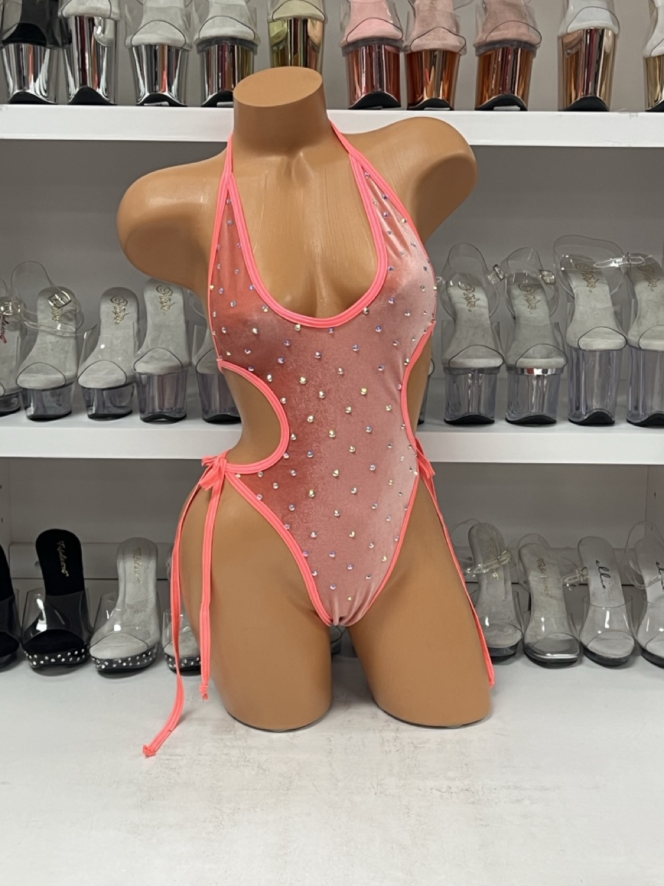 Velvet Coral Cut Out Romper with Rhinestones