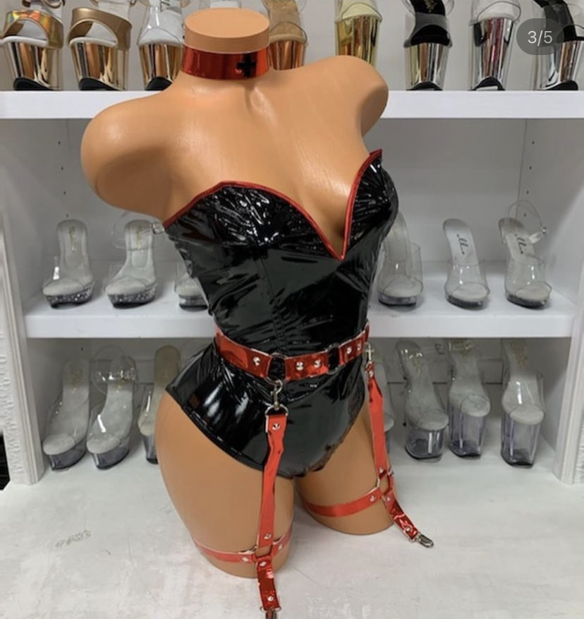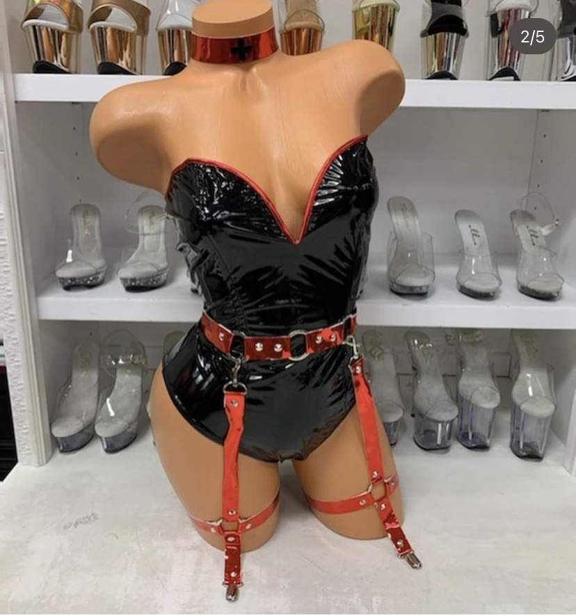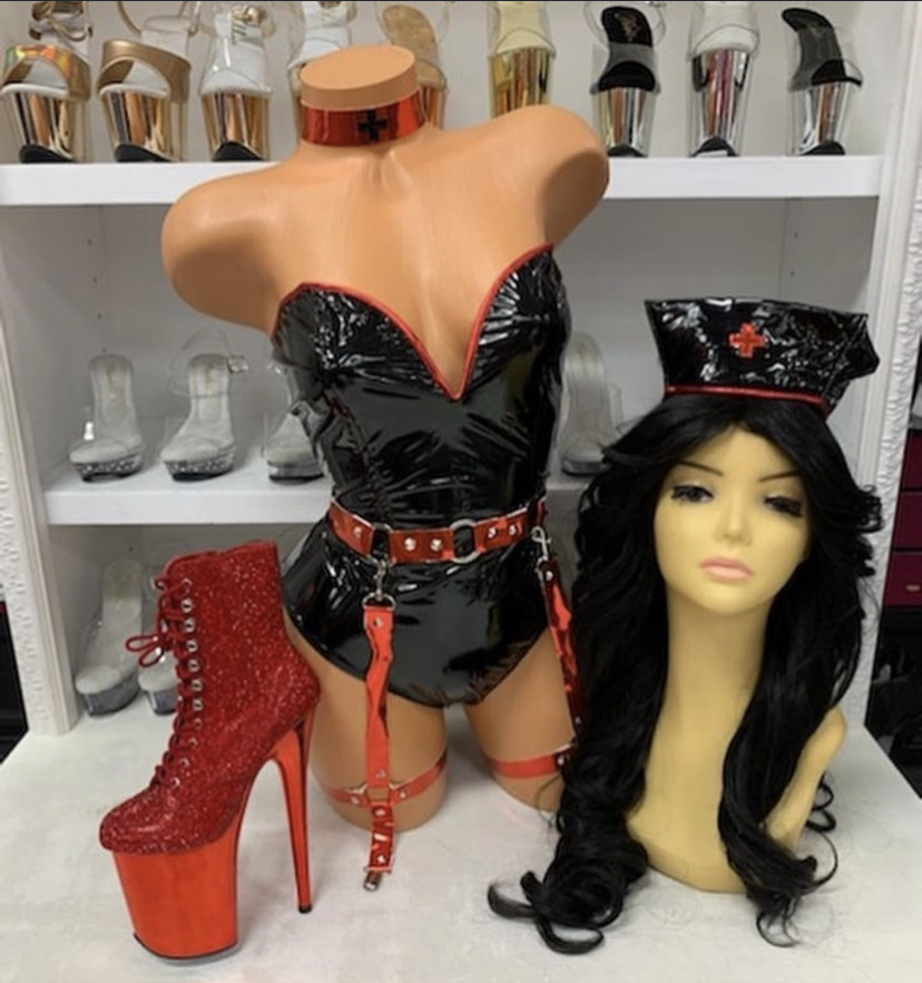 Black vinyl nurse bodysuit costume with red garter belt, choker, and medical headpiece