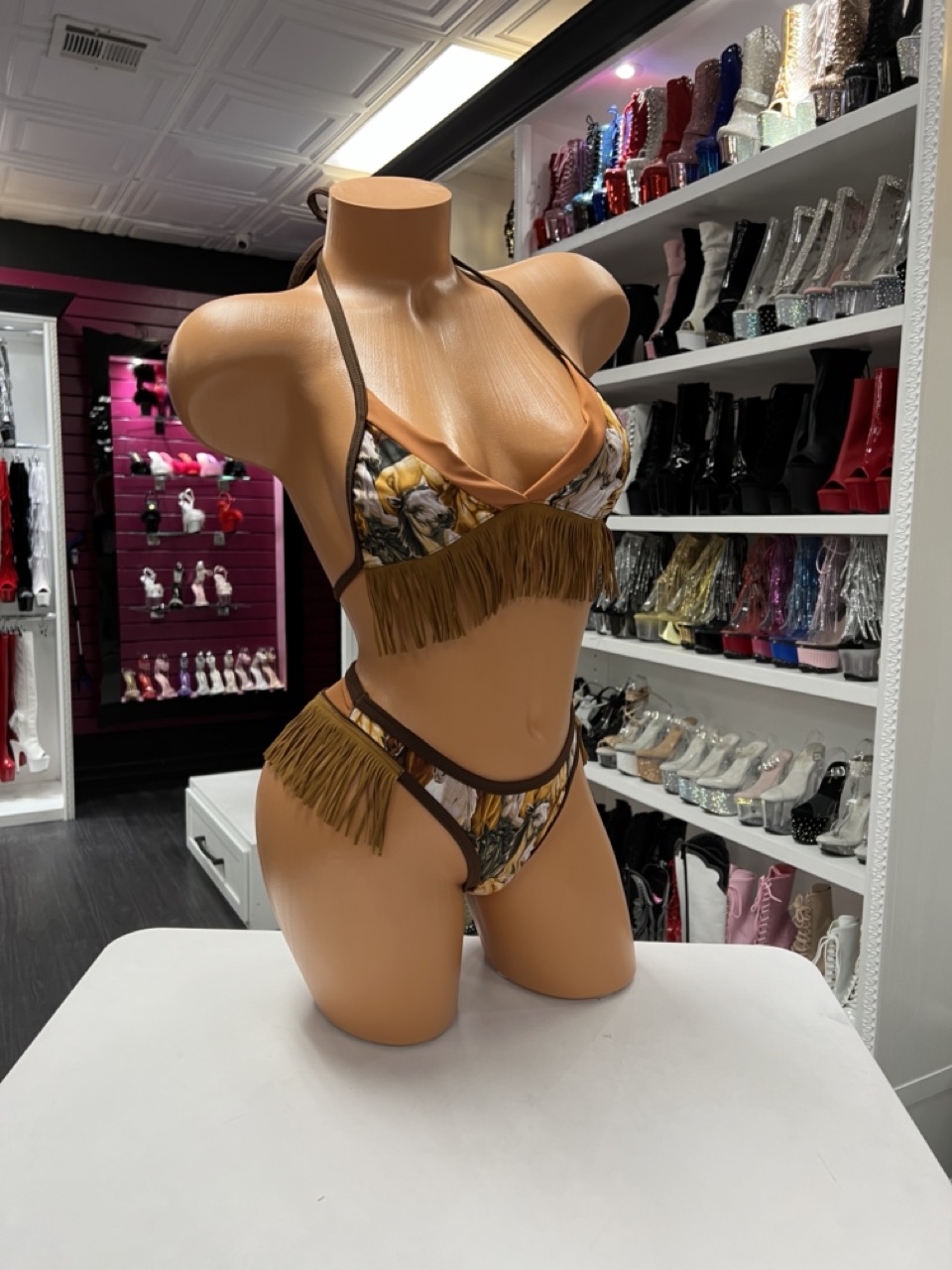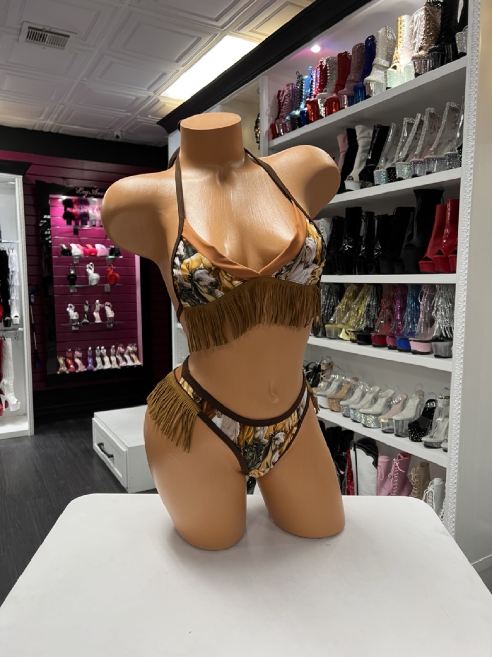 Western-inspired two-piece with camouflage print and warm brown fringe. Rugged tones with bold stage movement.