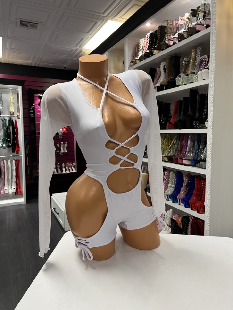 A white long-sleeve cutout romper with mesh sleeves, lace-up chest, and adjustable side ties. Soft, stretchy, and perfect for dancers and photoshoots.