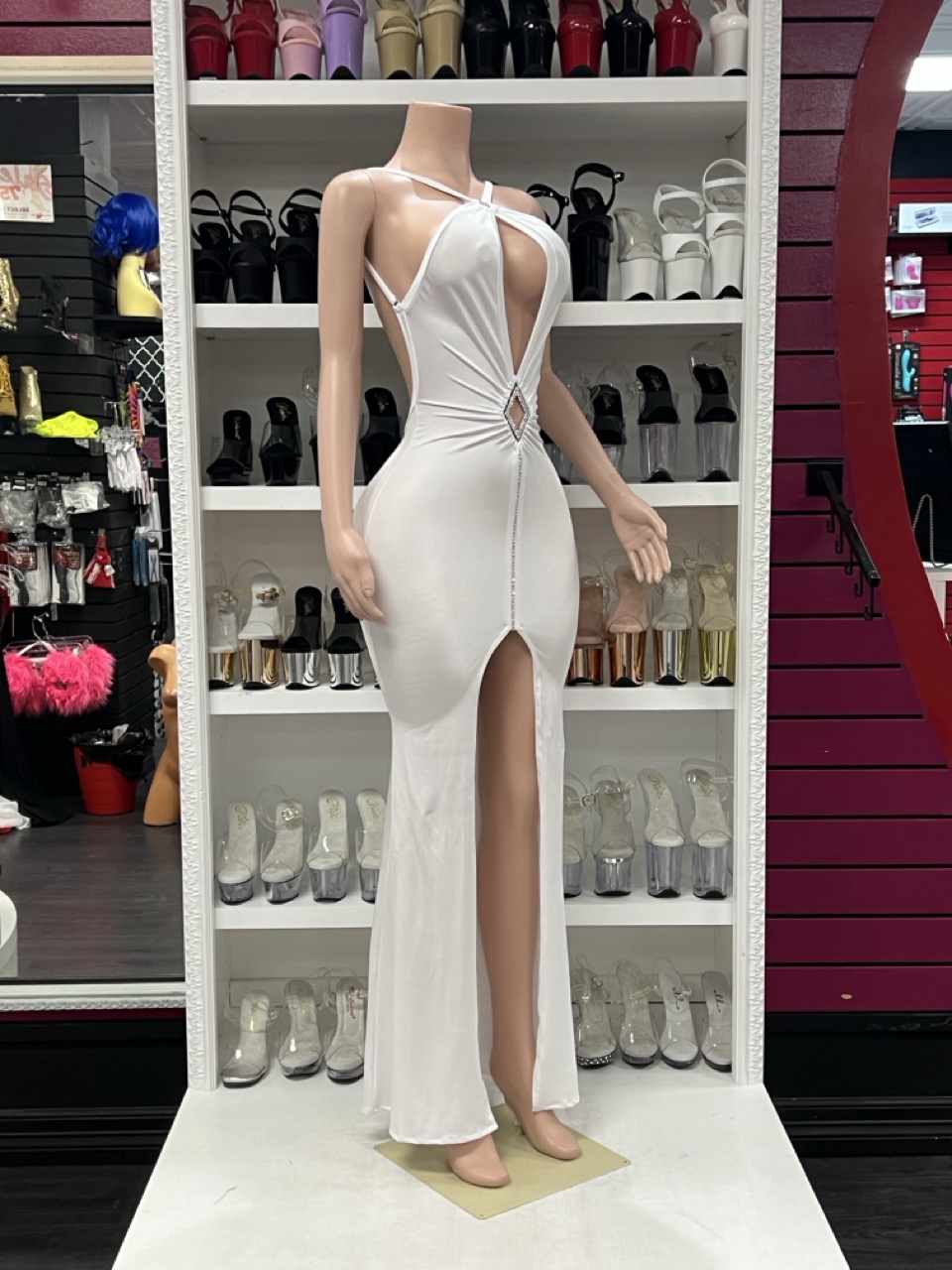 White diamond slit gown with keyhole front and rhinestone waist on mannequin