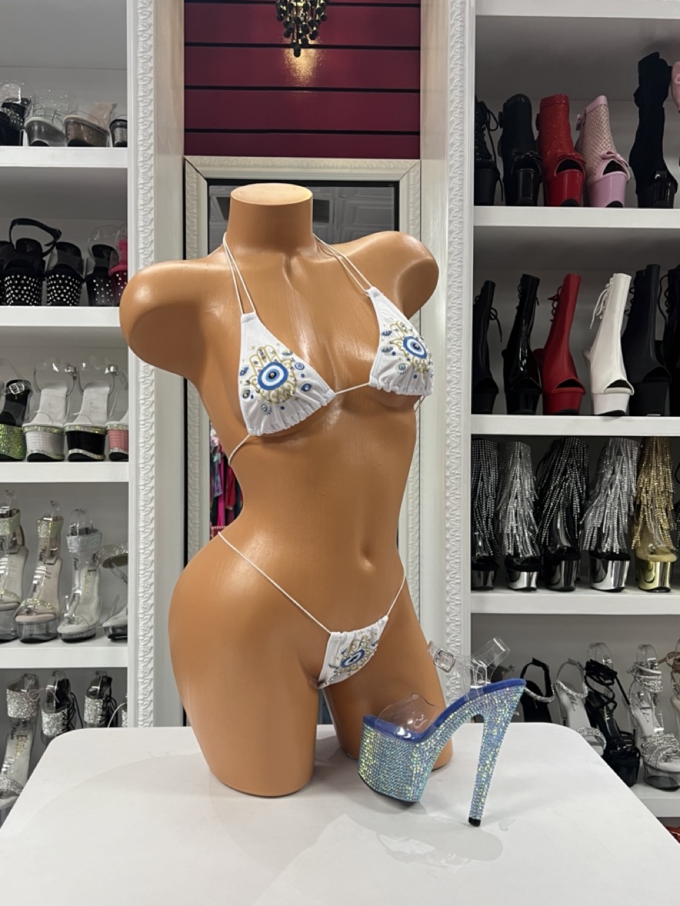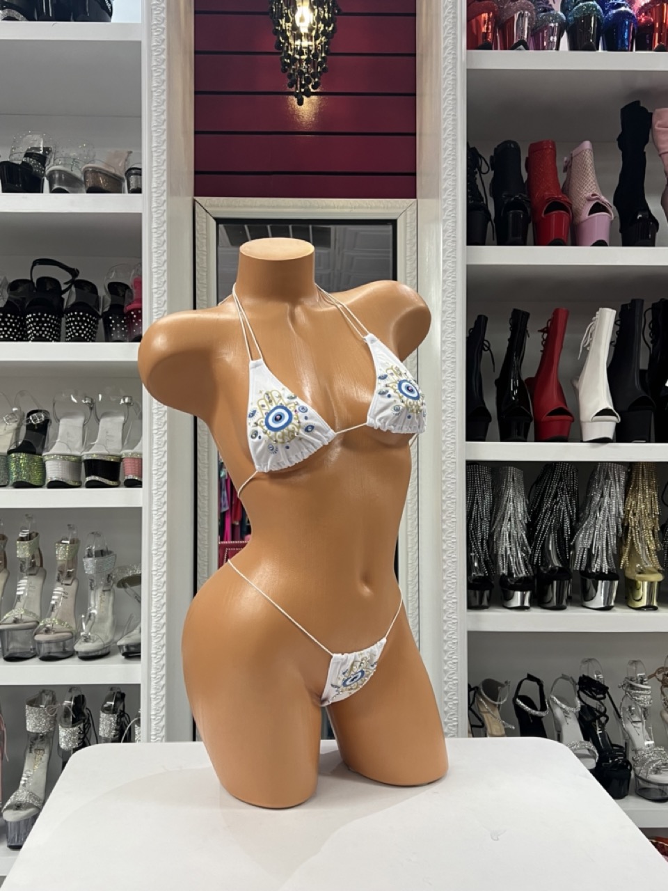 White bikini with evil eye design and rhinestone accents. Lightweight, adjustable, and perfect for a bold, flattering look.