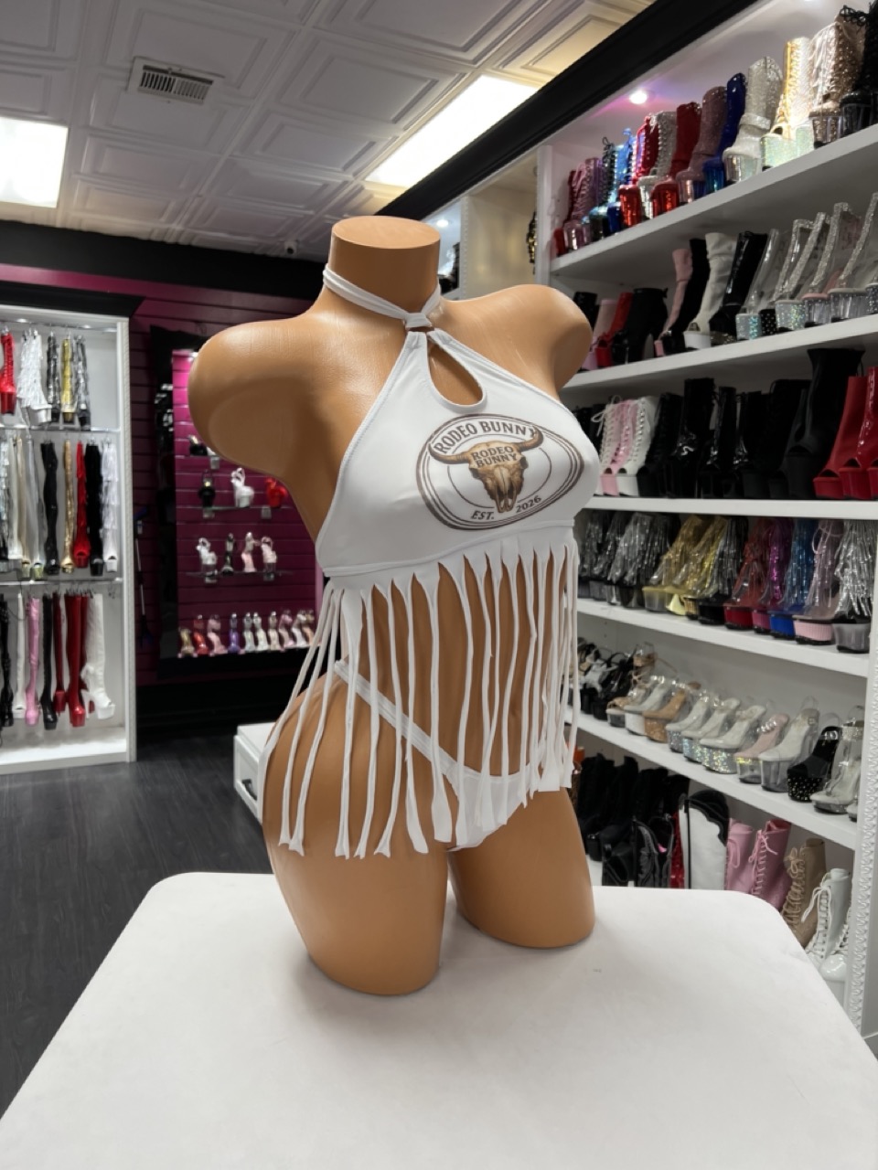 White western two-piece with halter graphic top and dramatic fringe. Crisp color with bold stage movement.