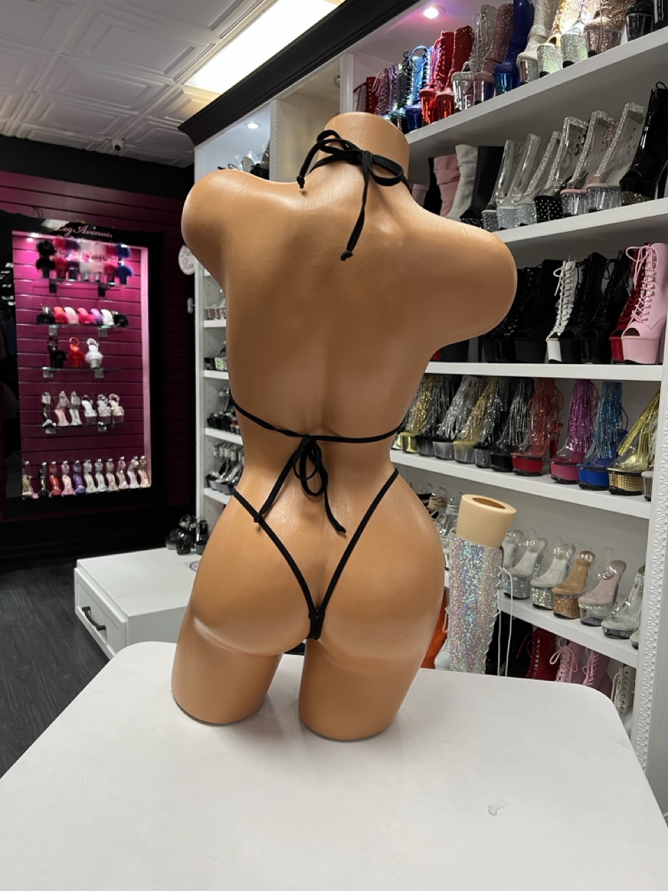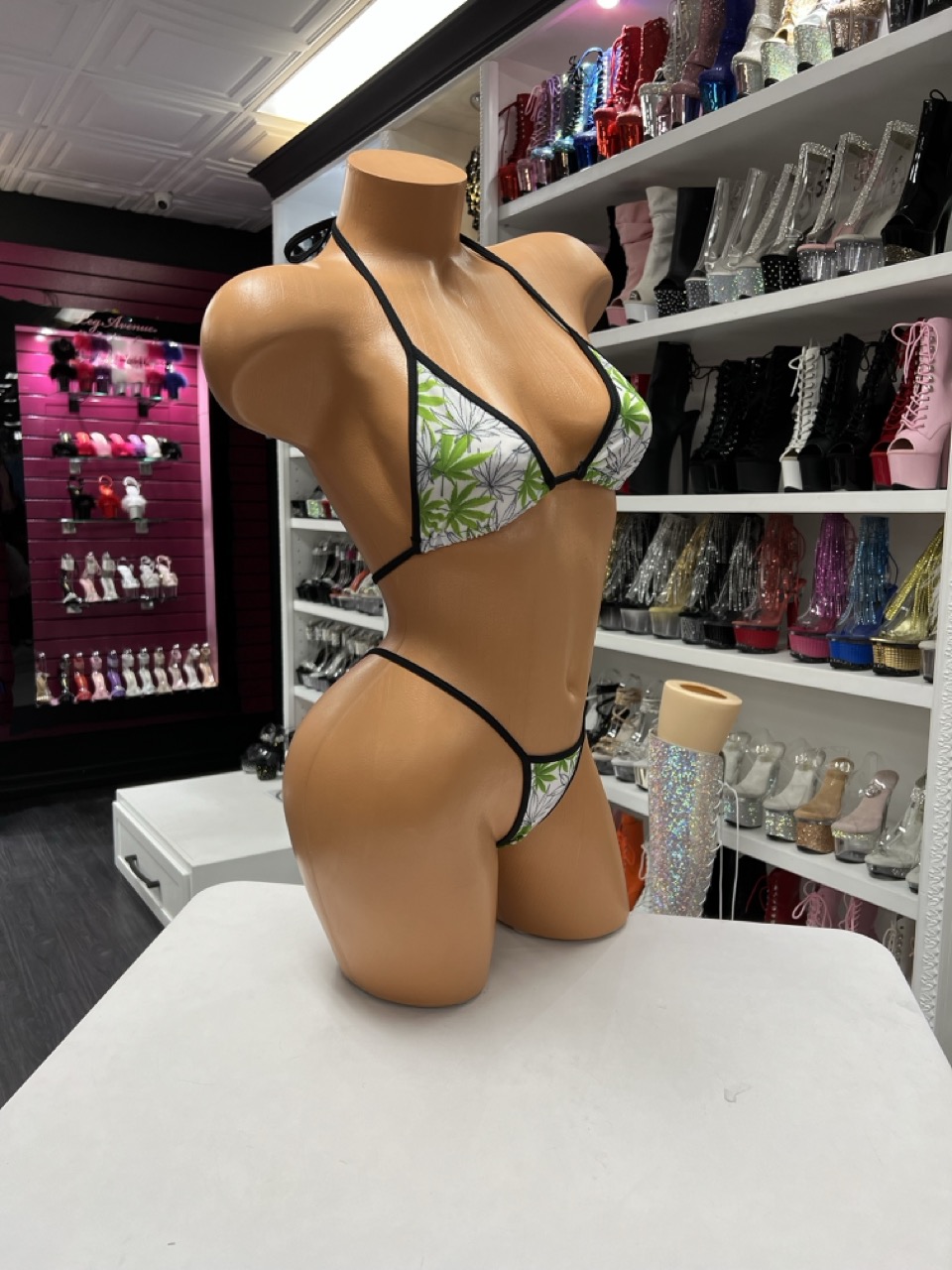 A white micro bikini with green leaf print and black trim. Perfect for performers who want a clean, bold, standout look.