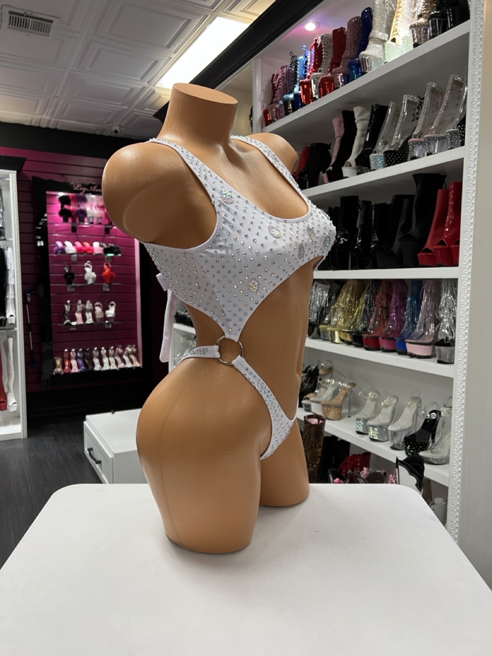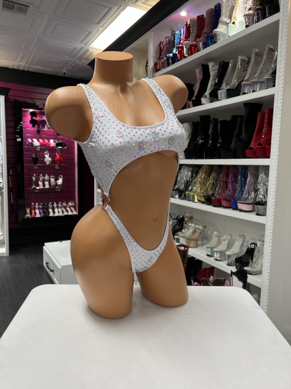 White Rhinestone Belly Romper with open belly cutout and crystal embellishments