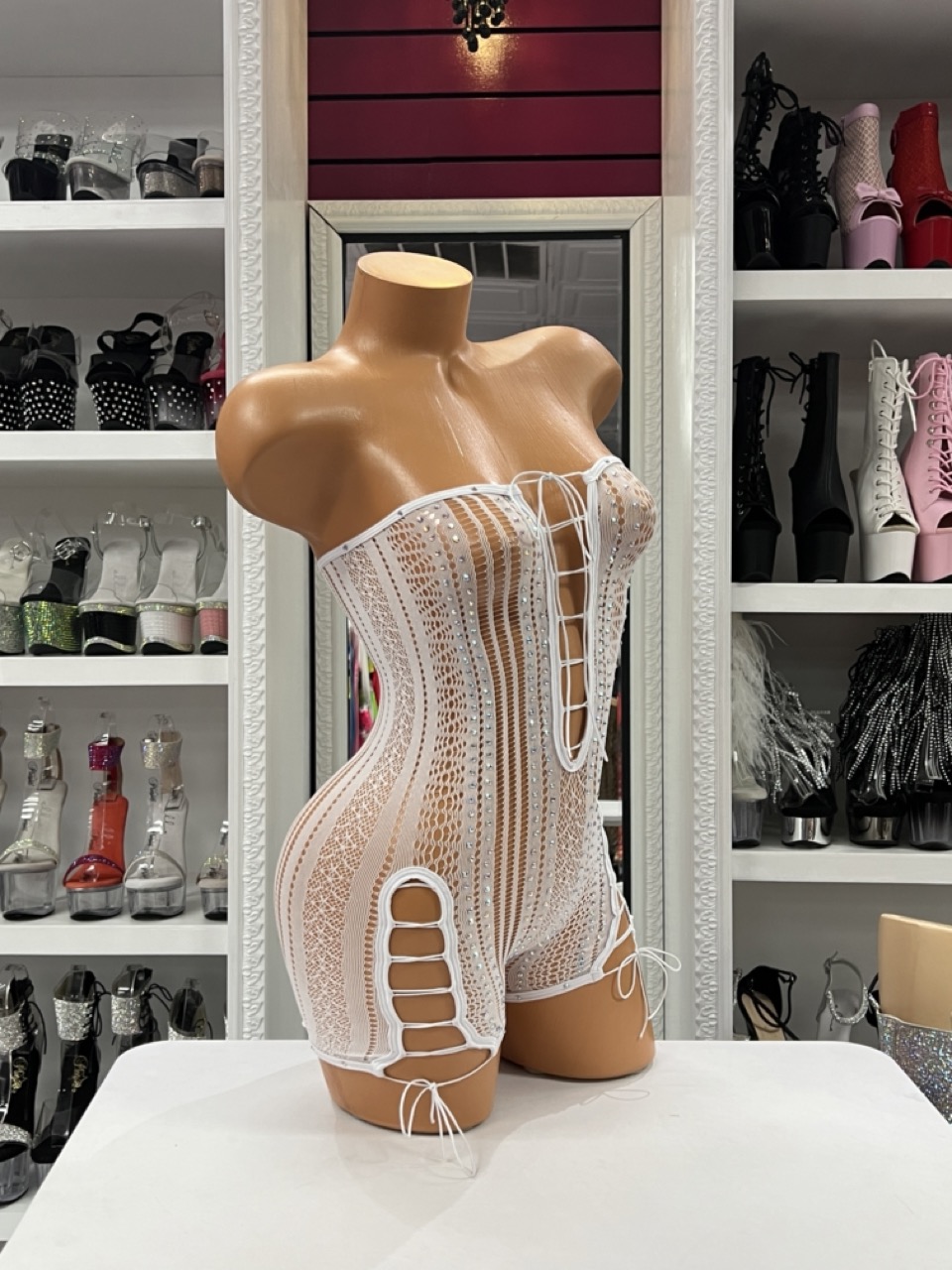 Strapless white lace romper with rhinestone sparkle and lace-up accents. Sculpted glam perfect for stage and bridal-inspired looks.