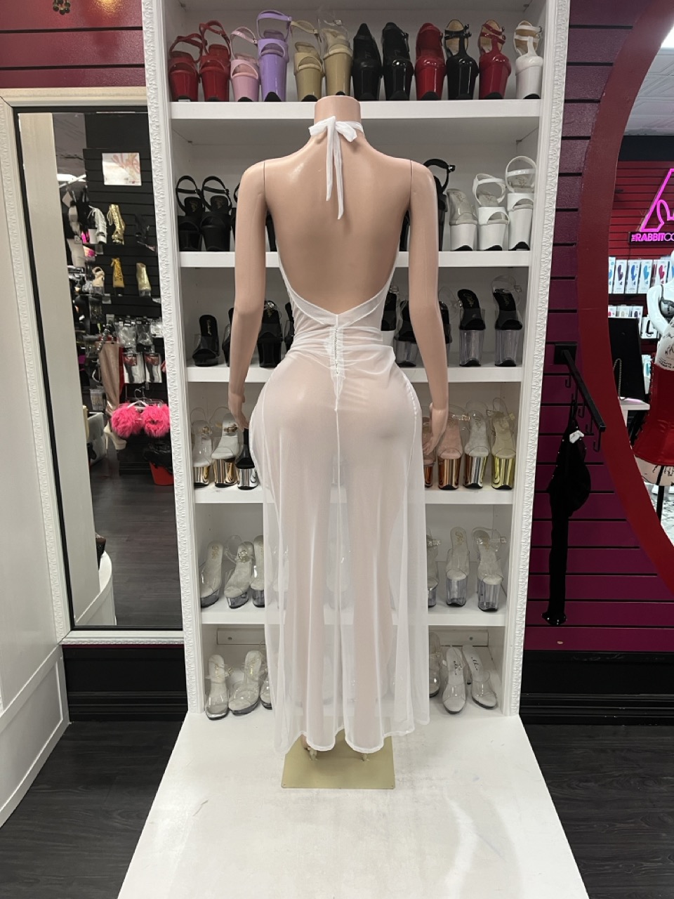 Sheer white halter dress with sparkling choker neckline and bold high slit. Lightweight, stretchy, and made for confident stage movement.