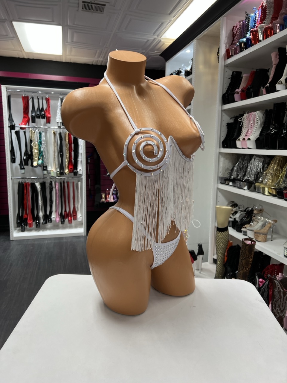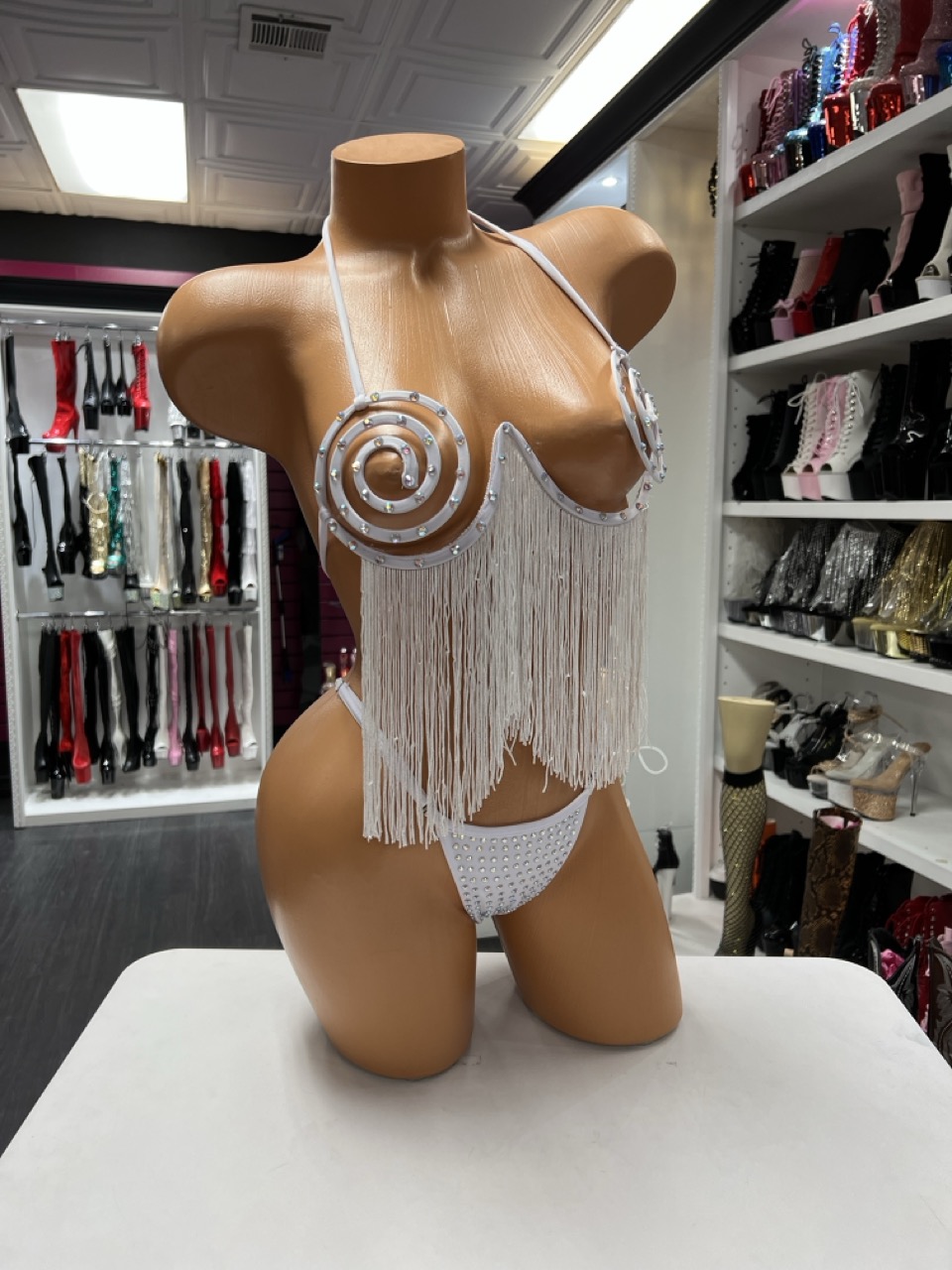 Two-piece white spiral fringe set with rhinestone spiral cups and dramatic flowing fringe. Designed for bold stage presence and elegant performance movement.