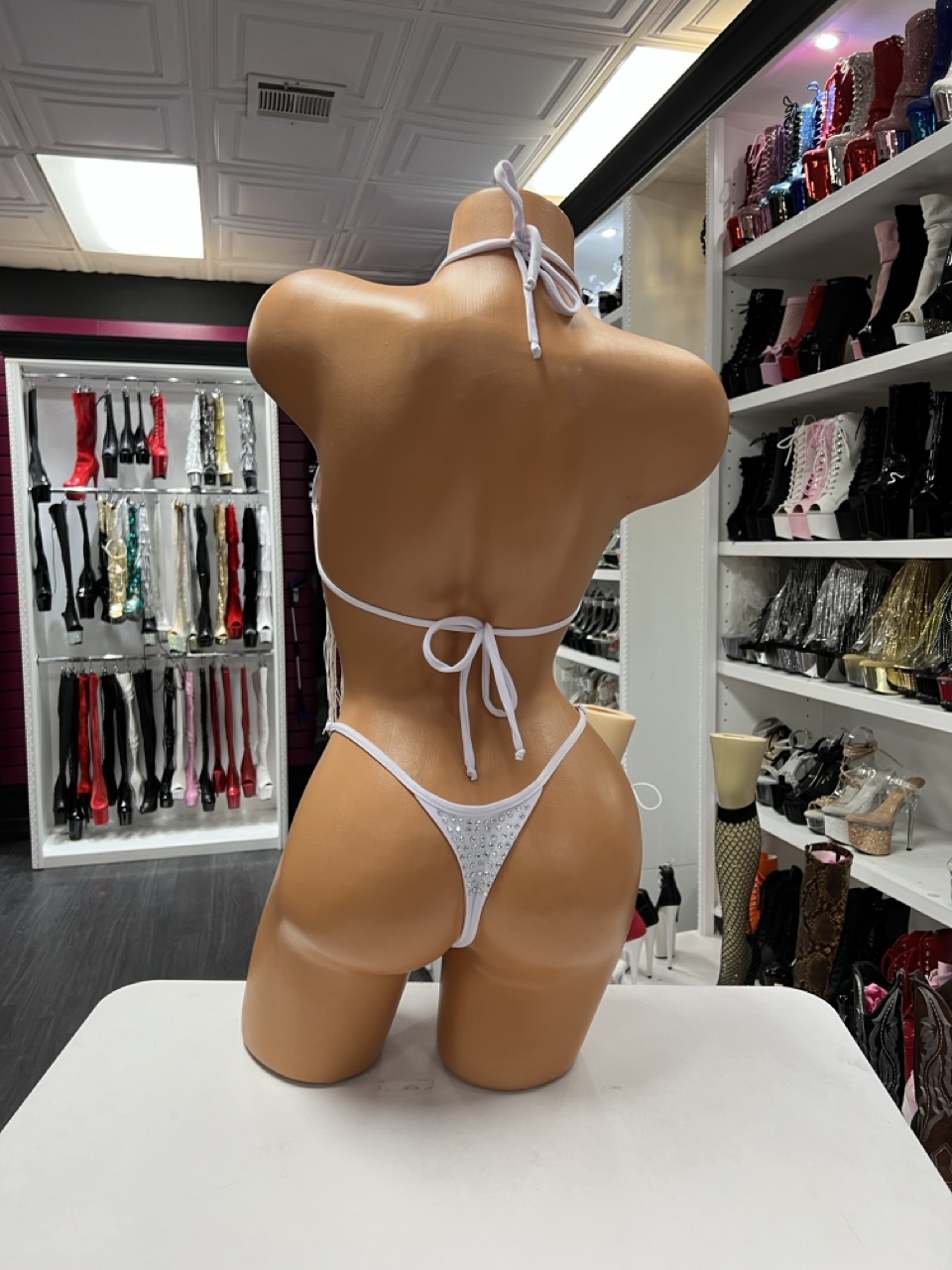 White Spiral Fringe Set with rhinestone spiral cups and long fringe performance outfit