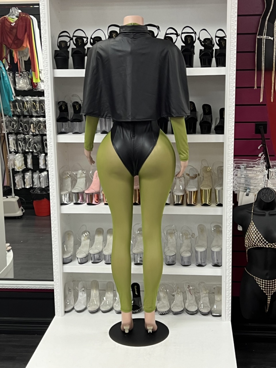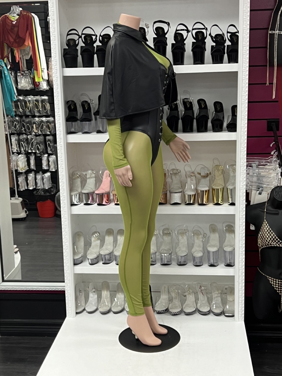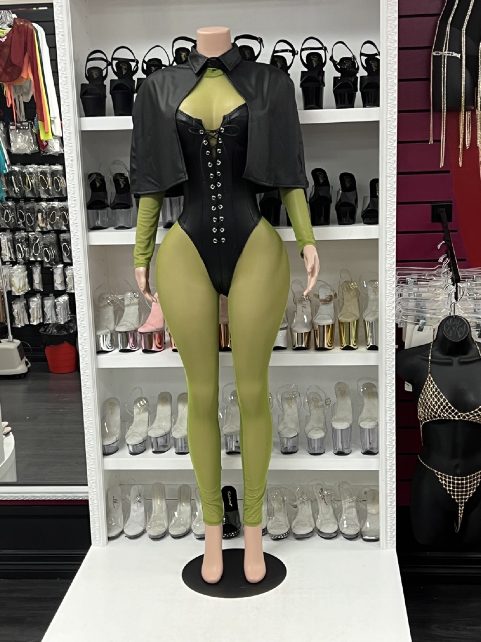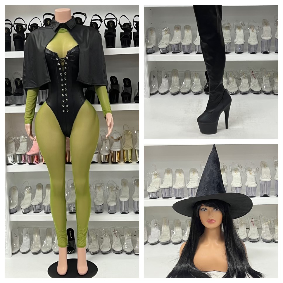 4-piece sexy movie character costume features sheer mesh mockneck jumpsuit and faux leather underwire cup lace-up bodysuit and matching cape and felt witch hat. No returns or exchanges.