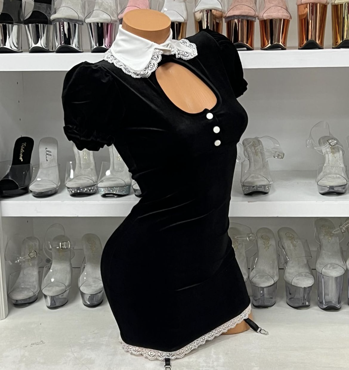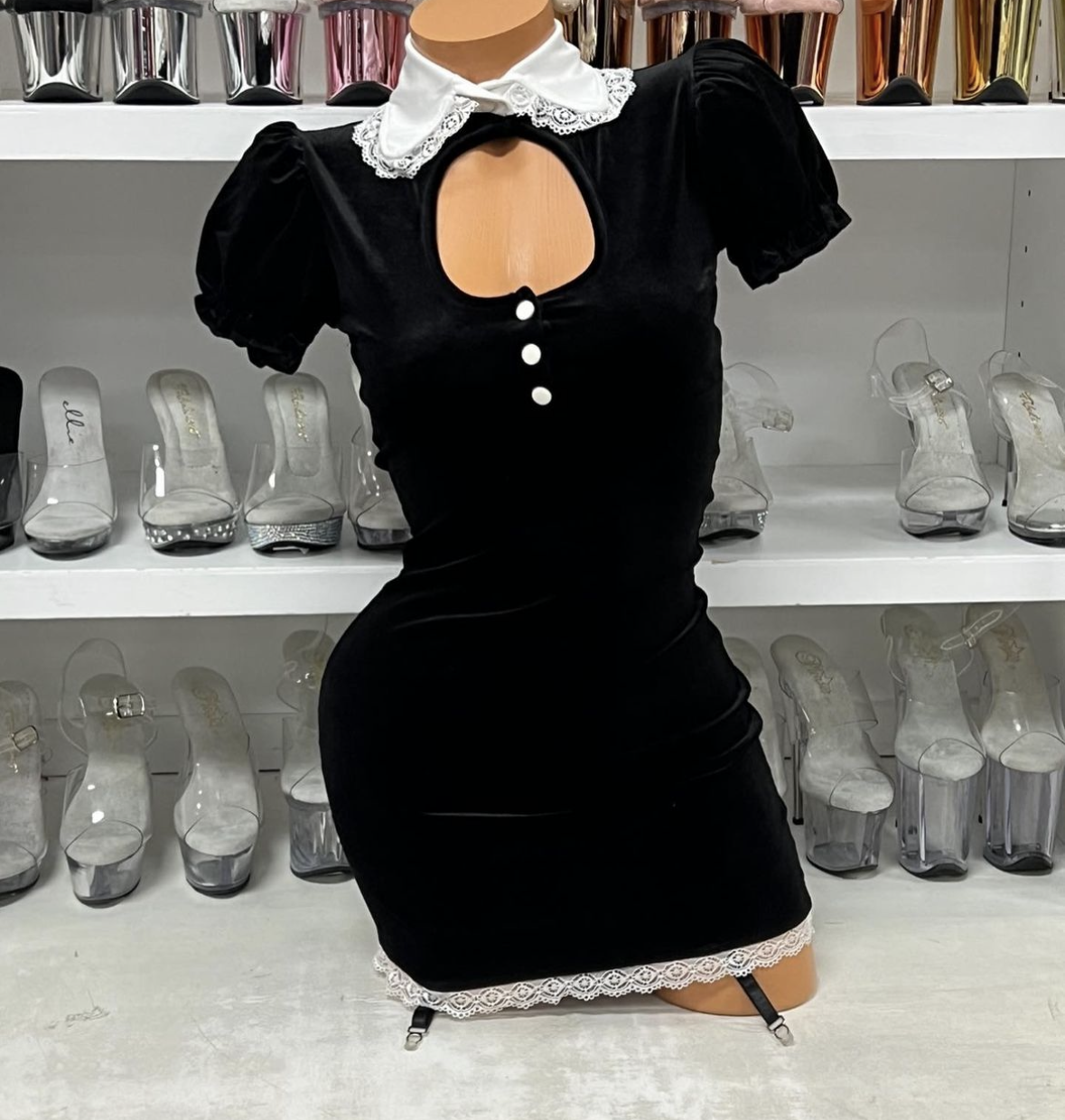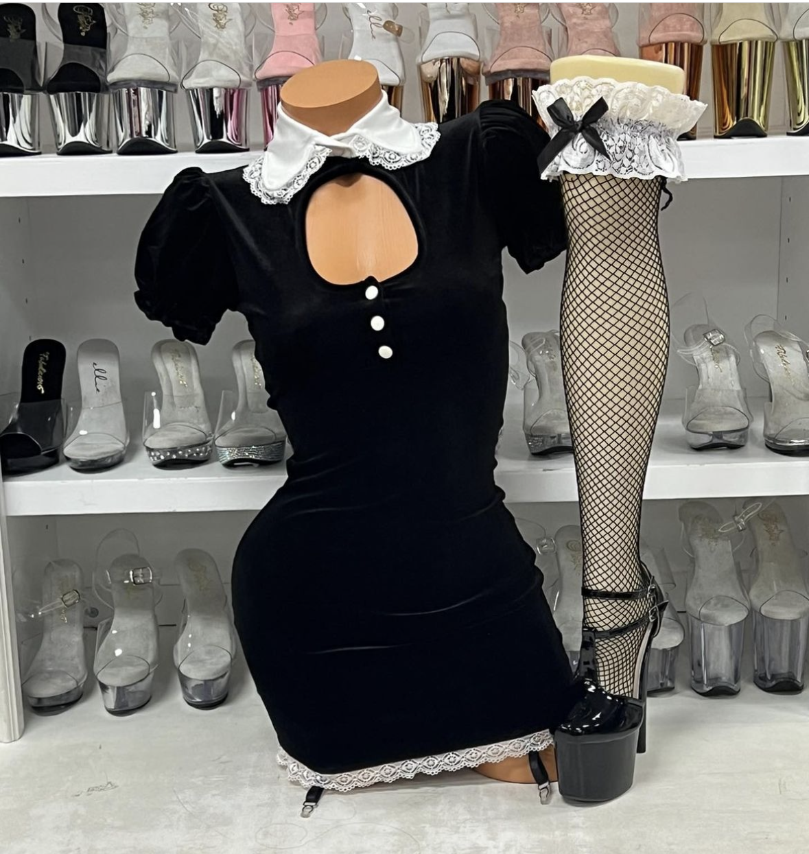 Be sexy and spooky in this gothic movie character costume. You’ll be everyone’s woman crush wednesday in this dress with matching fingerless gloves and thigh highs. No returns or exchanges.