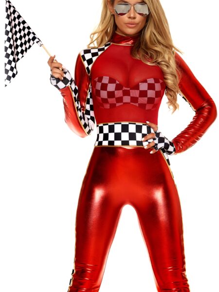 You’ll be hotter than a hot rod in our Women’s First Place Racer Costume. With a fiery red metallic catsuit contrasted with checker print and matching sexy gloves and aviator sunglasses, you’ll have everyone racing to catch a glimpse of you. No returns or exchanges.