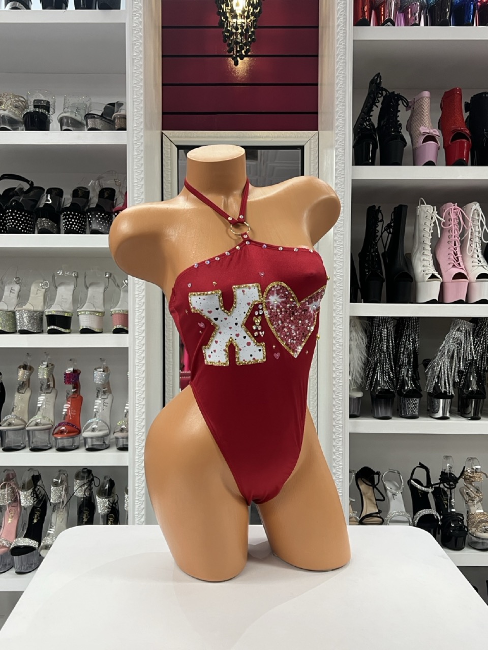Red halter bodysuit featuring rhinestone “XO” lettering and sparkling heart detail for a bold stage-ready look.