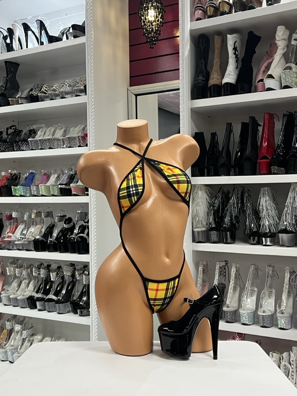 Turn heads in this bold Yellow Plaid Slingshot Bikini featuring a crossed halter neckline, high-cut thong design, and daring plaid print for maximum impact.